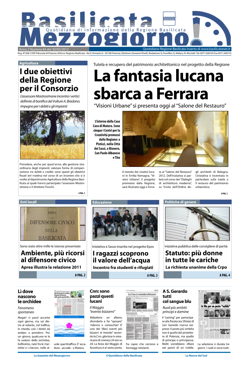 Marzo 30, 2012 On line Basilicata MezzogiornoIn primo piano nell’edizione odierna di Basilicata Mezzogiorno: gli impegni dell’assessore Mastrosimone per il Consorzio di bonifica Vulture...