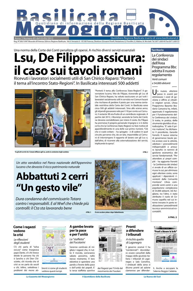 Maggio 3, 2012 On line Basilicata MezzogiornoIn primo piano nell’edizione odierna di Basilicata Mezzogiorno l’impegno del presidente De Filippo nel riportare la questione Lsu...