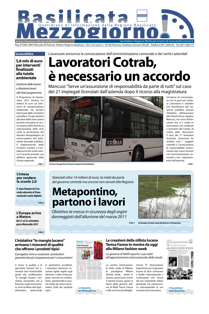 Settembre 19, 2012 On line Basilicata MezzogiornoIn primo piano nell’edizione odierna l'incontro sulla situazione dei lavoratori Cotrab, l'avvio del Piano di compensazione ambientale e...