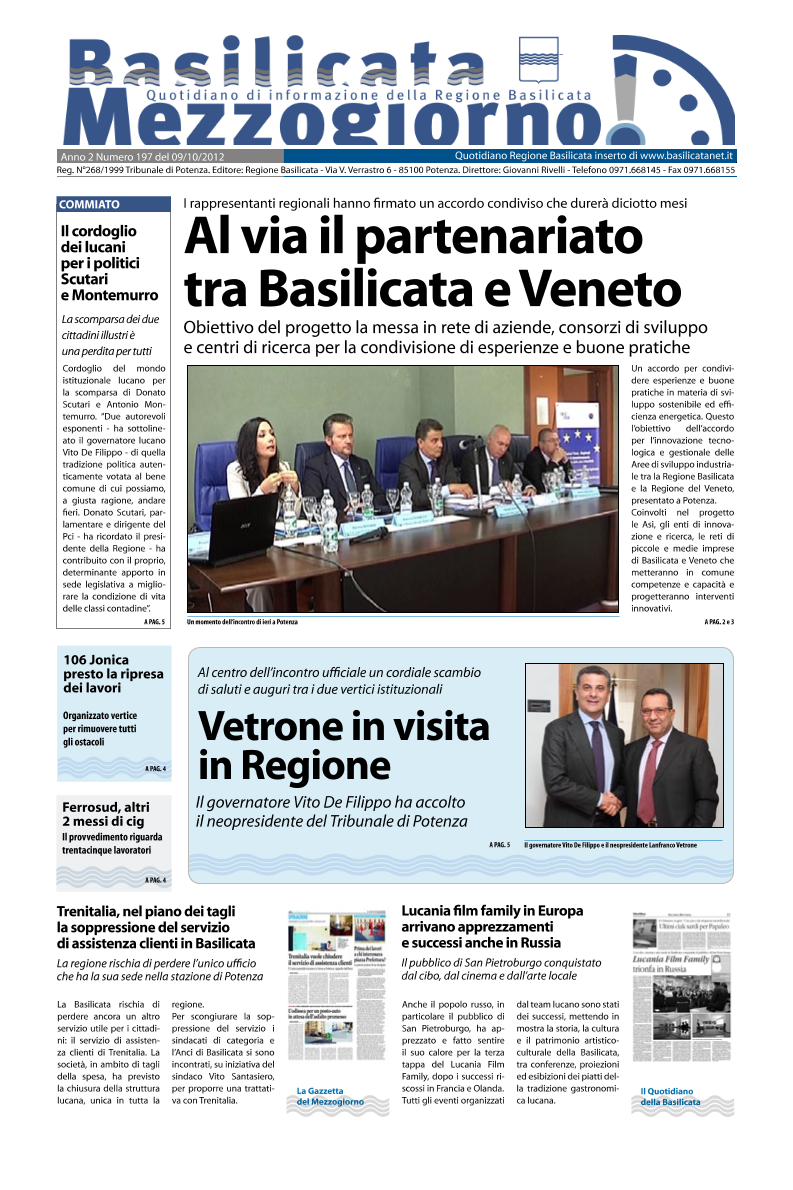 Ottobre 9, 2012 On line Basilicata MezzogiornoIn primo piano nell’edizione odierna il Protocollo con la Regione del Veneto per le Aree di sviluppo industrialeBasilicata...