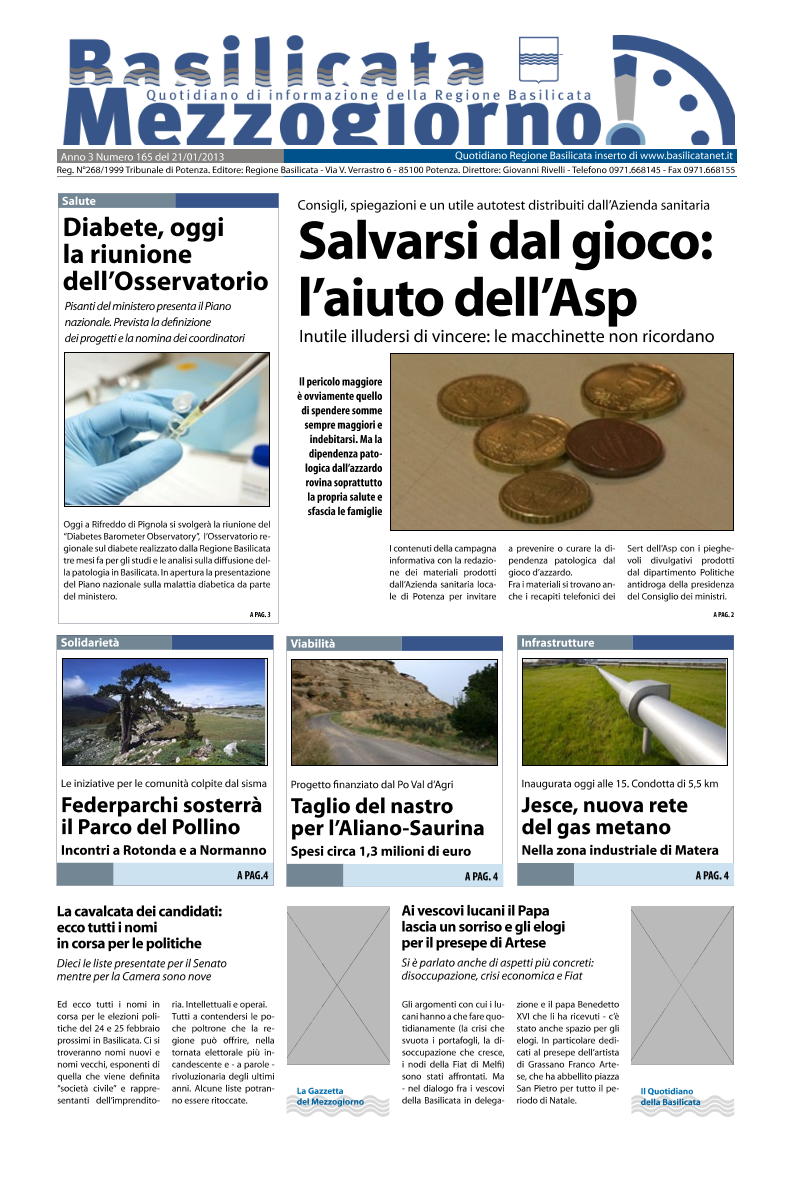 Gennaio 21, 2013 On line Basilicata MezzogiornoIn primo piano nell’edizione odierna di Basilicata Mezzogiorno le dipendenze dal gioco d’azzardo messe in evidenza da una...