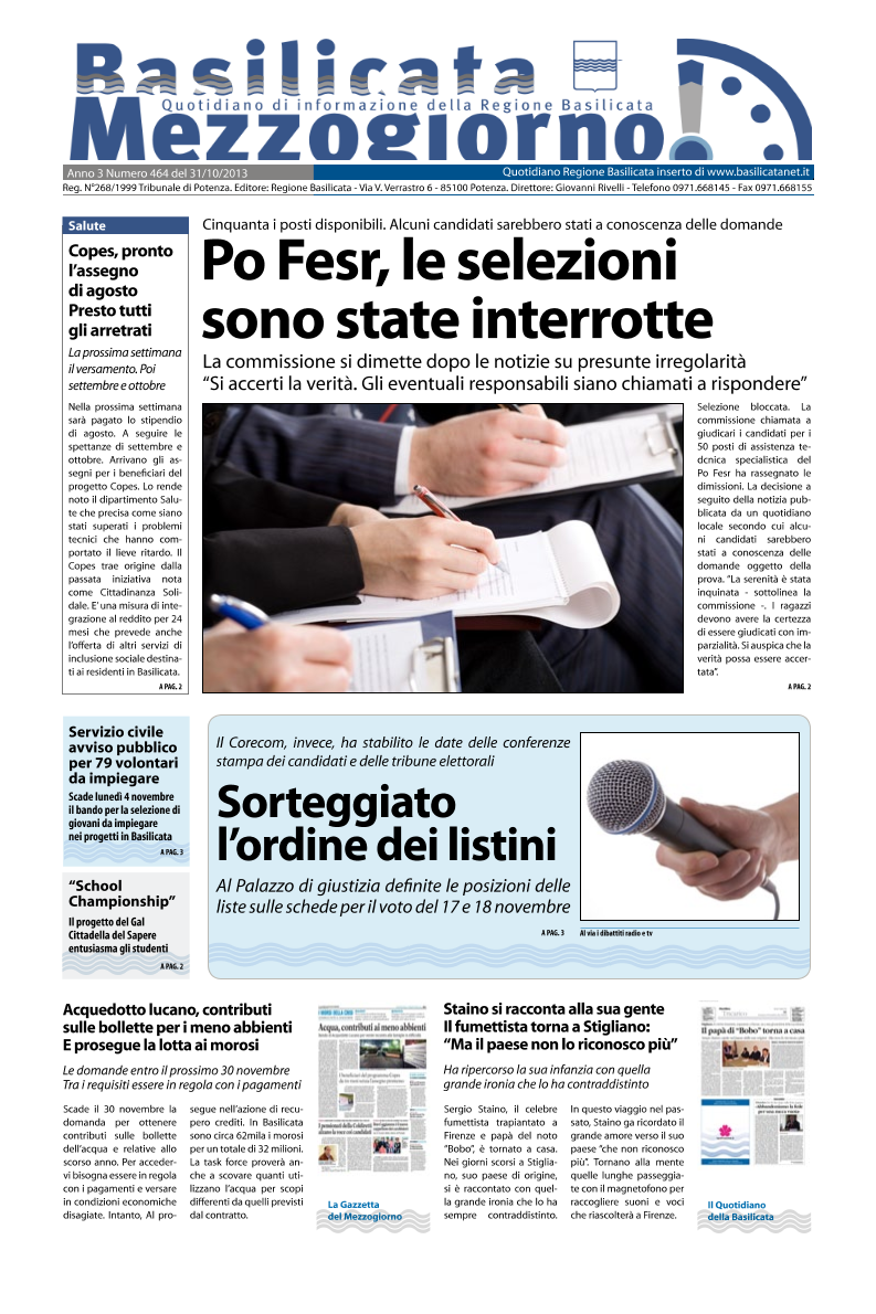 Ottobre 31, 2013 On line Basilicata MezzogiornoIn primo piano nell’edizione odierna: la sospensione del concorso del Po Fesr e la notizia del pagamento delle...
