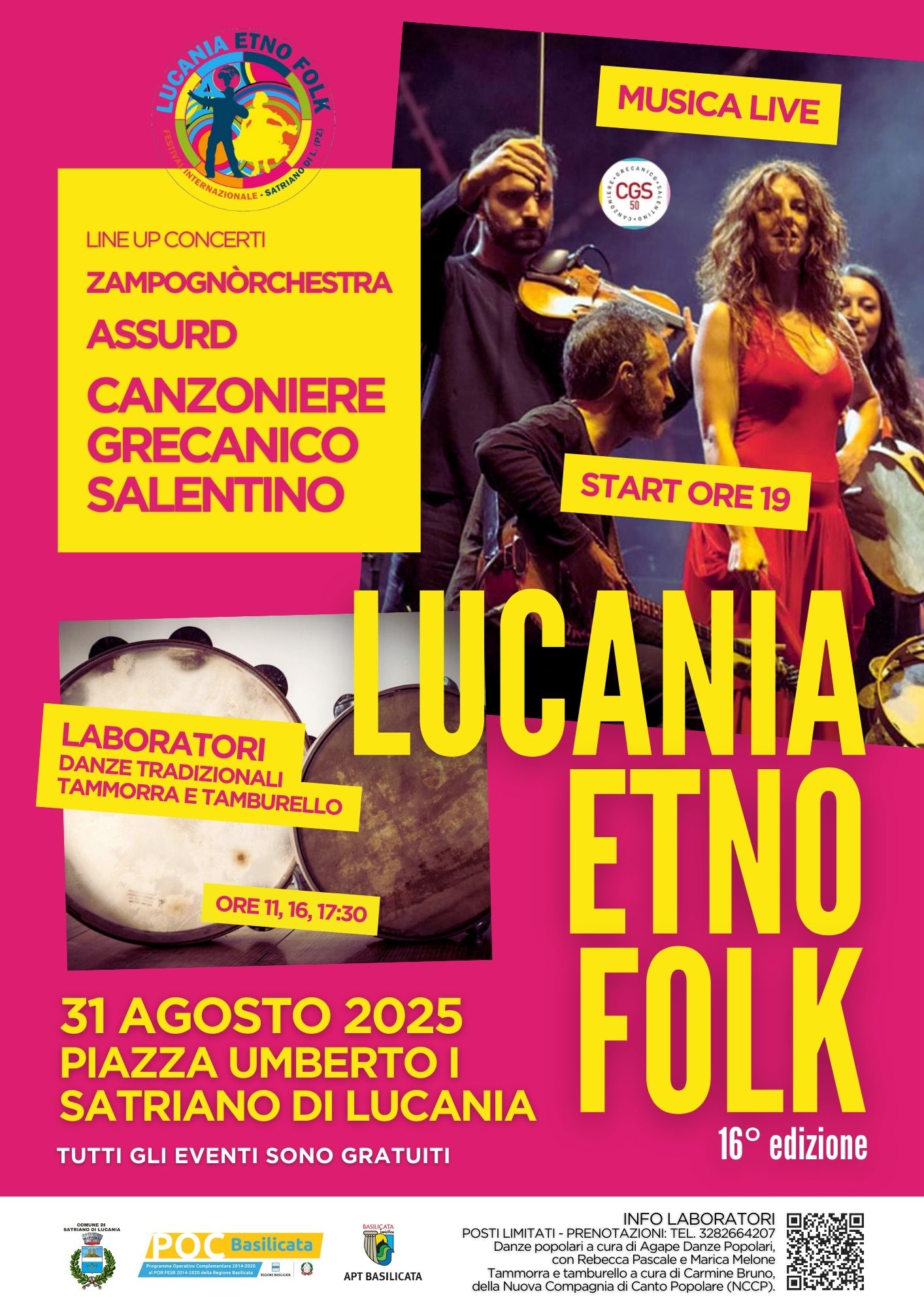 Agosto 21, 2025 Satriano di L., il 31/08 Lucania Etno FolkNato con l’intento di valorizzare il patrimonio musicale popolare del Sud Italia, il festival è un appuntamento fisso...