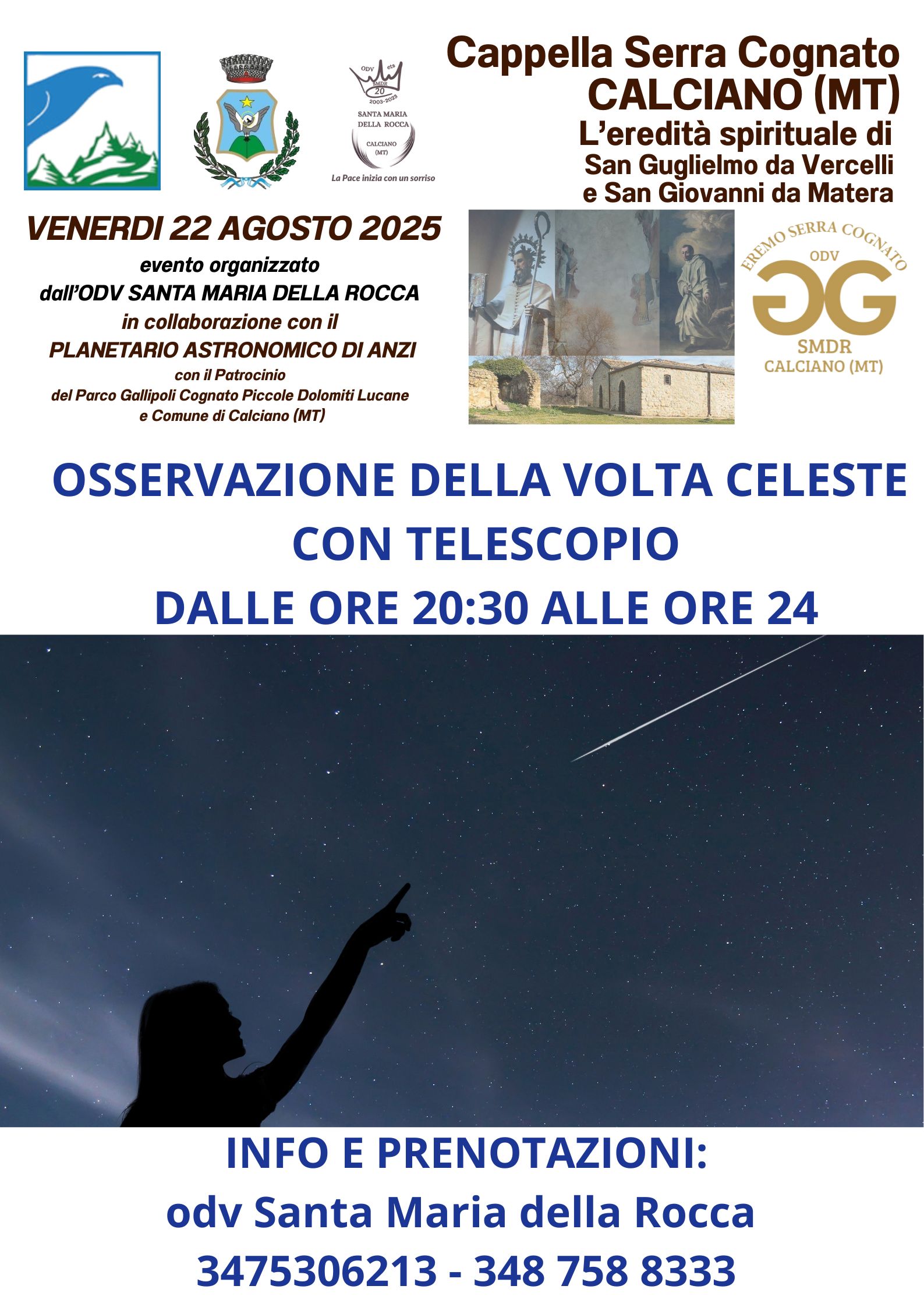 Agosto 21, 2025 A Calciano il 22/08 osservazione delle stelleAppuntamento venerdì 22 agosto all’Eremo di Serra Cognato nel cuore del Parco Regionale di Gallipoli Cognato – Piccole Dolomiti...