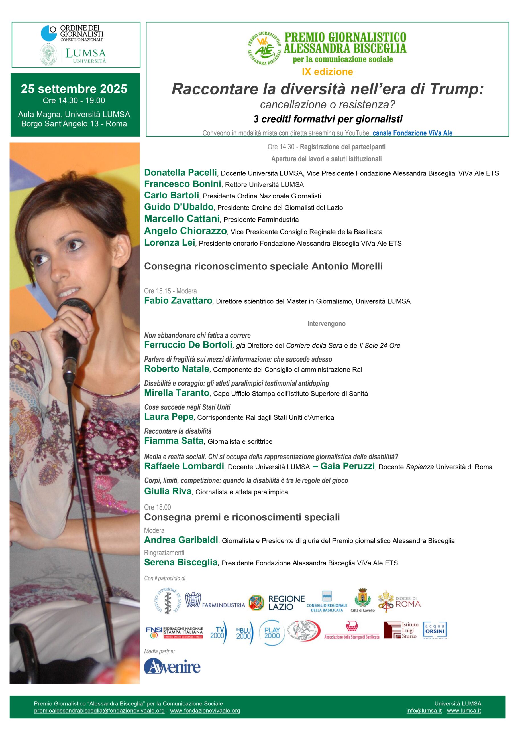 Settembre 9, 2025 A Roma il premio Alessandra BiscegliaSi terrà giovedì 25 settembre presso l'Aula Magna dell'Università Lumsa di Roma, in Borgo Sant’Angelo 13, il convegno...
