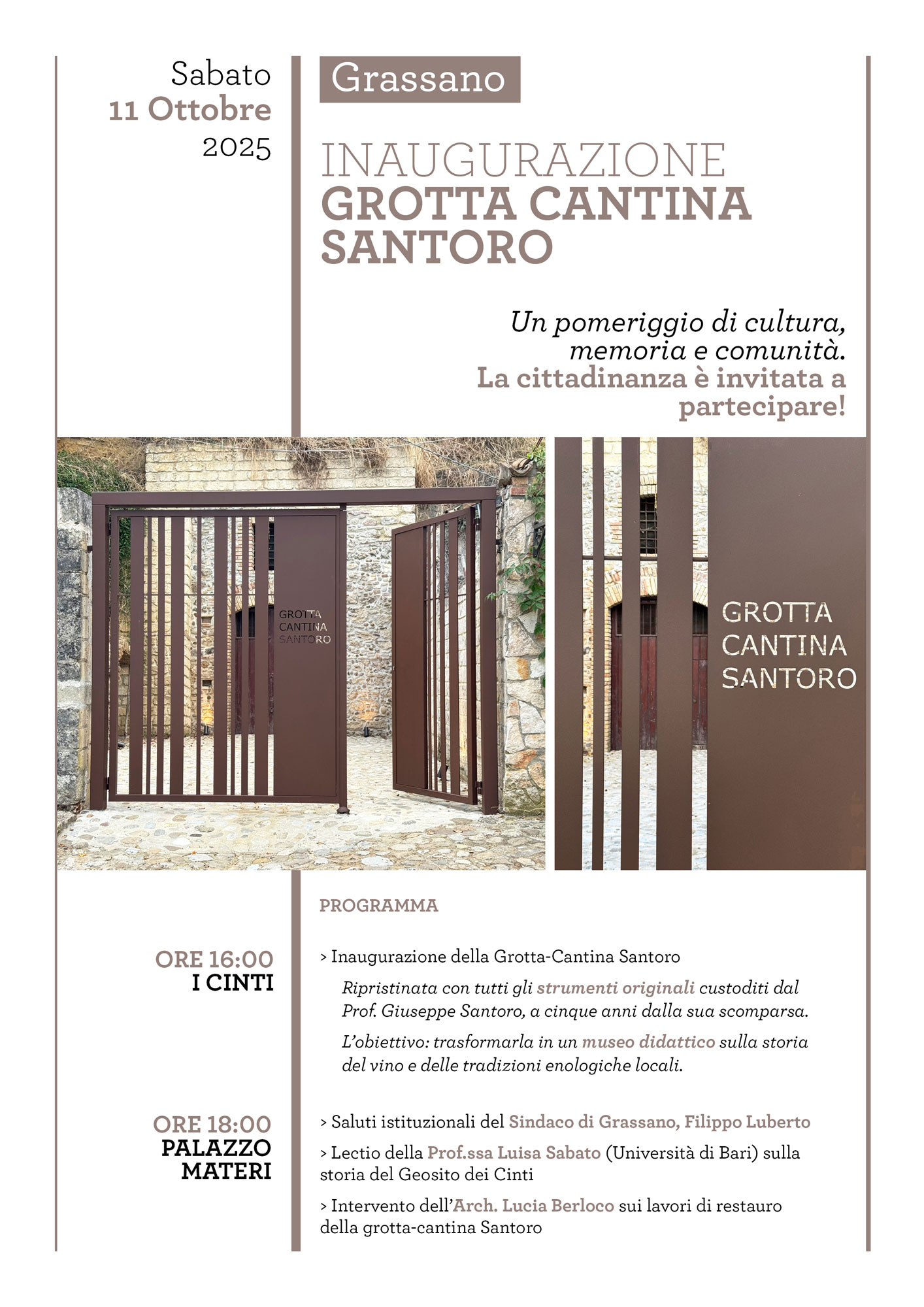 Ottobre 8, 2025 Cinti Grassano: riapre grotta cantina SantoroVerrà aperta al pubblico a Grassano per la prima volta, sabato 11 ottobre 2025 alle 16,00, la Grotta-Cantina...