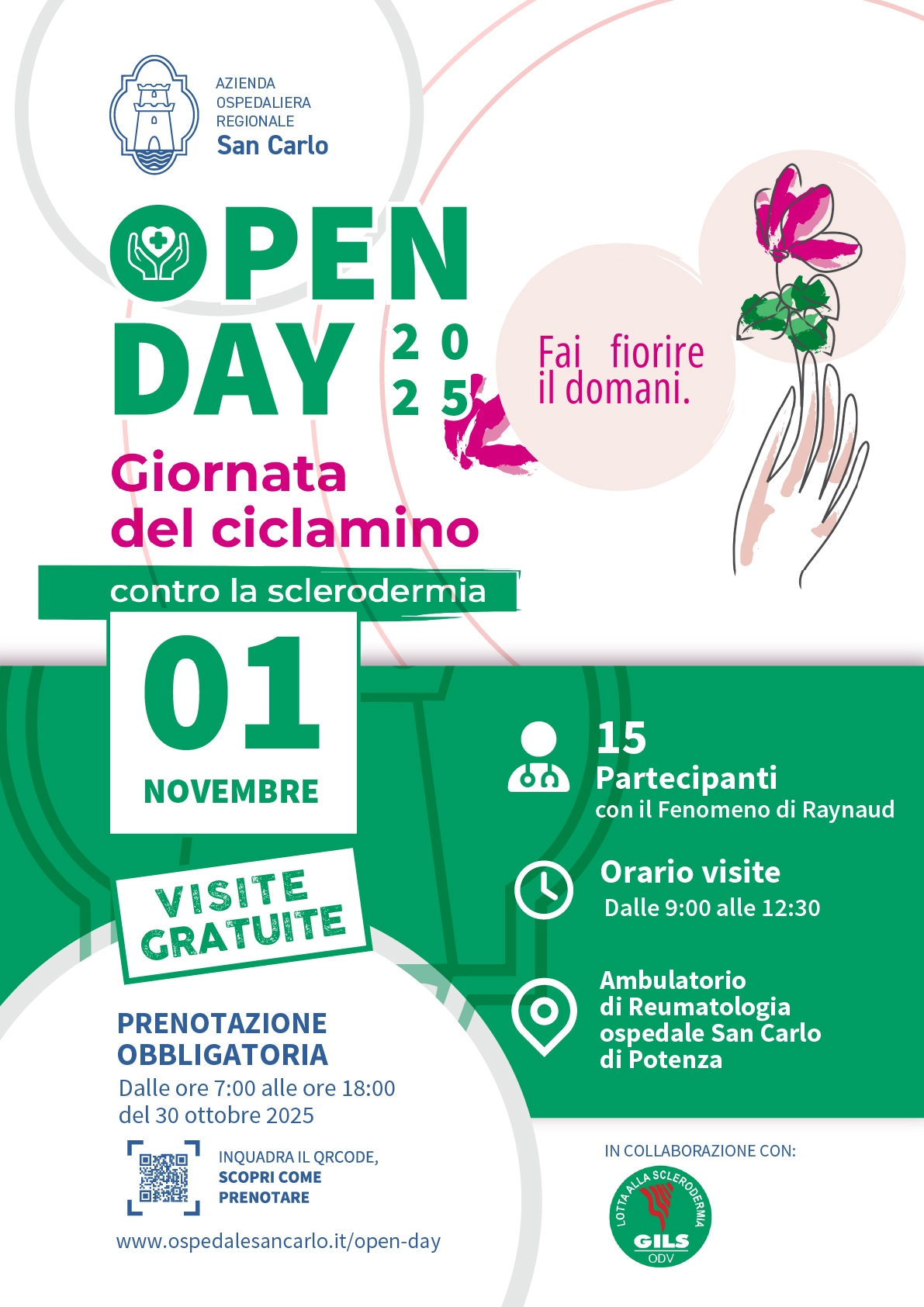 Ottobre 29, 2025 Al San Carlo open day dedicato alla Sclerosi sistemicaL’Azienda Ospedaliera Regionale San Carlo di Potenza partecipa all’iniziativa nazionale “Giornata del Ciclamino”, promossa da GILS (Gruppo...