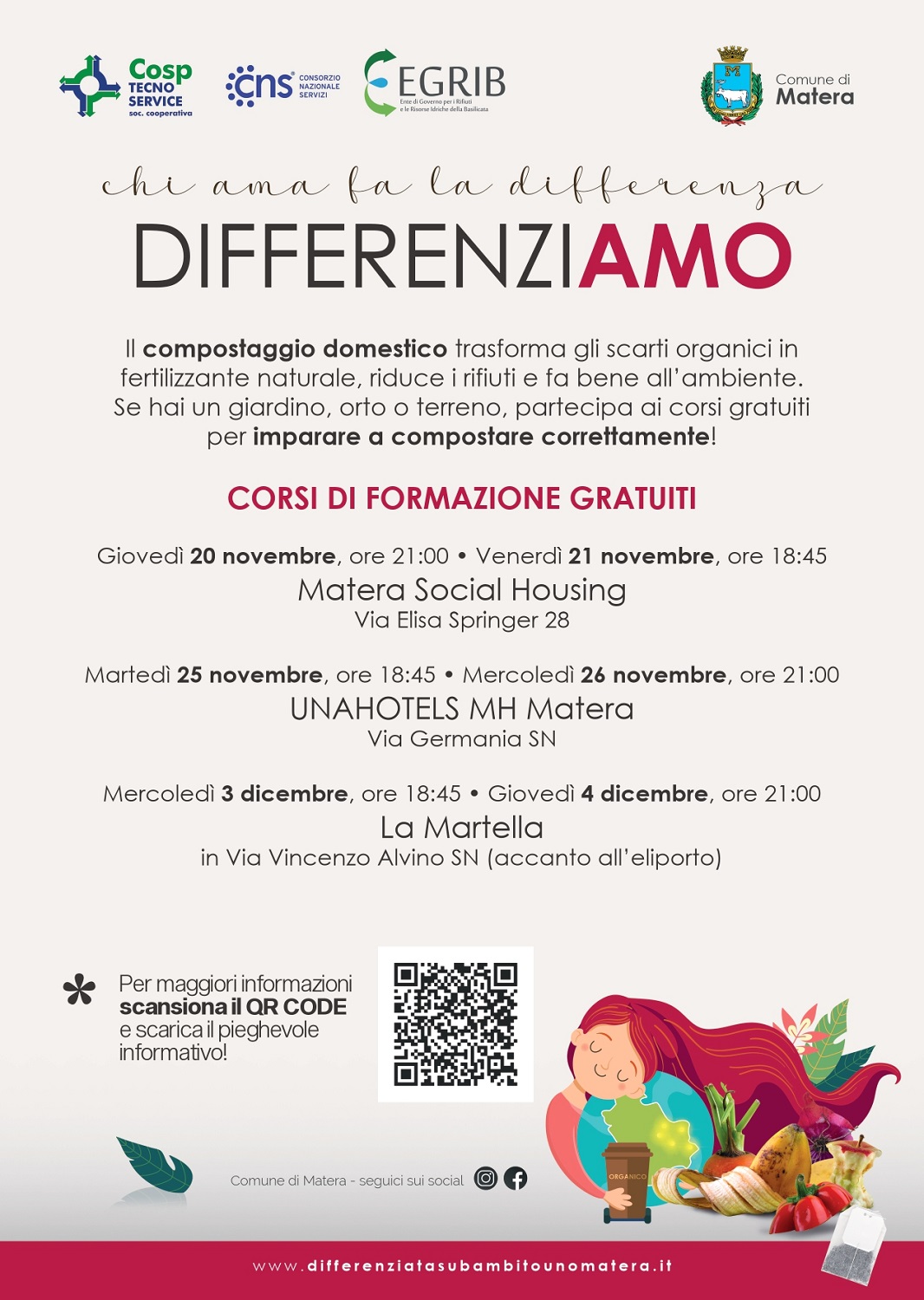 Novembre 14, 2025 A Matera corsi gratuiti di compostaggio domesticoProsegue la campagna di sensibilizzazione “DifferenziAmo – Chi Ama fa la differenza”, promossa da COSP Tecno Service e...