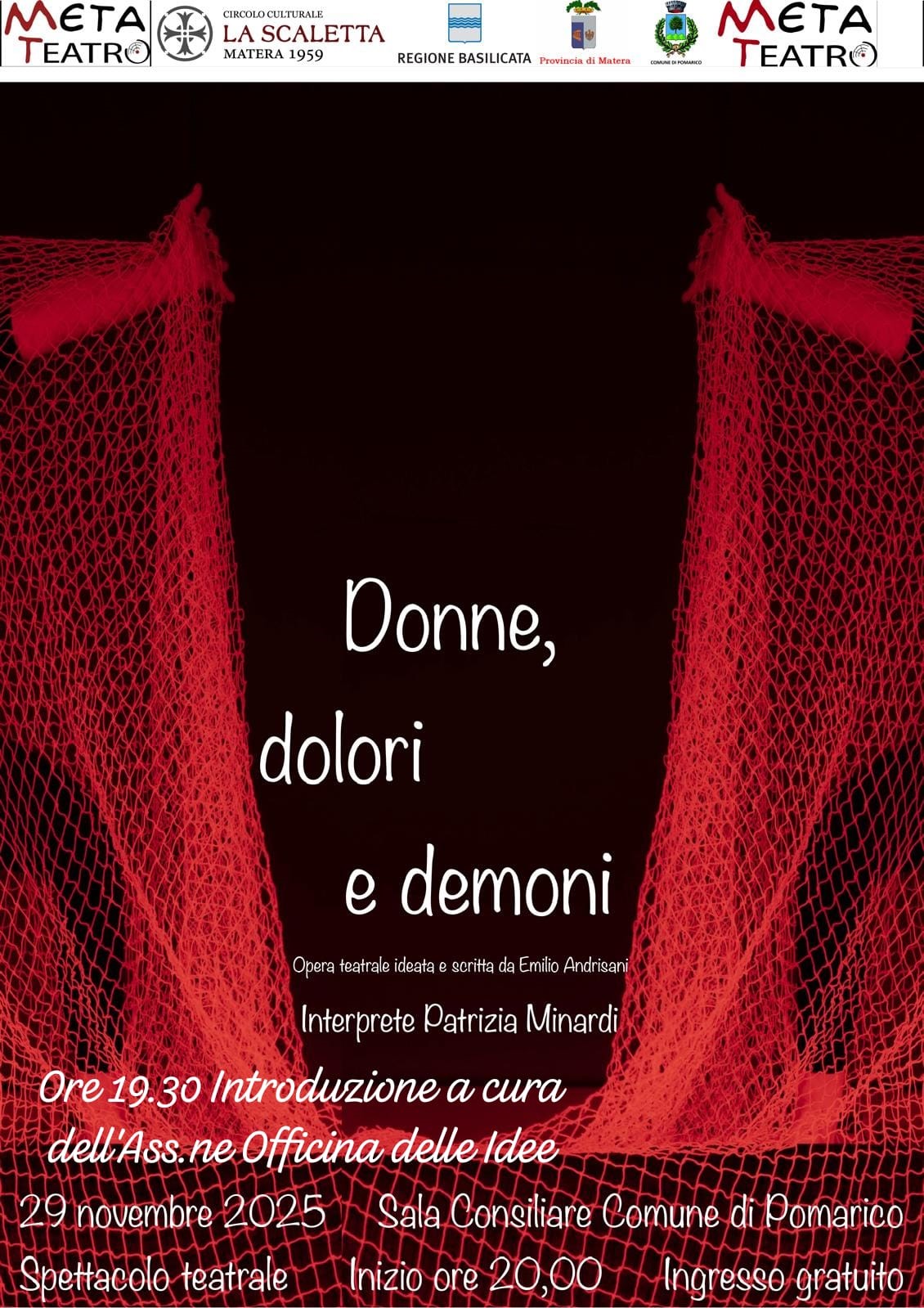 Novembre 27, 2025 A Pomarico in scena “Donne, dolore e demoni”“La Meta Teatro, con il supporto morale del Circolo Culturale La Scaletta Matera 1959 e con il patrocinio...