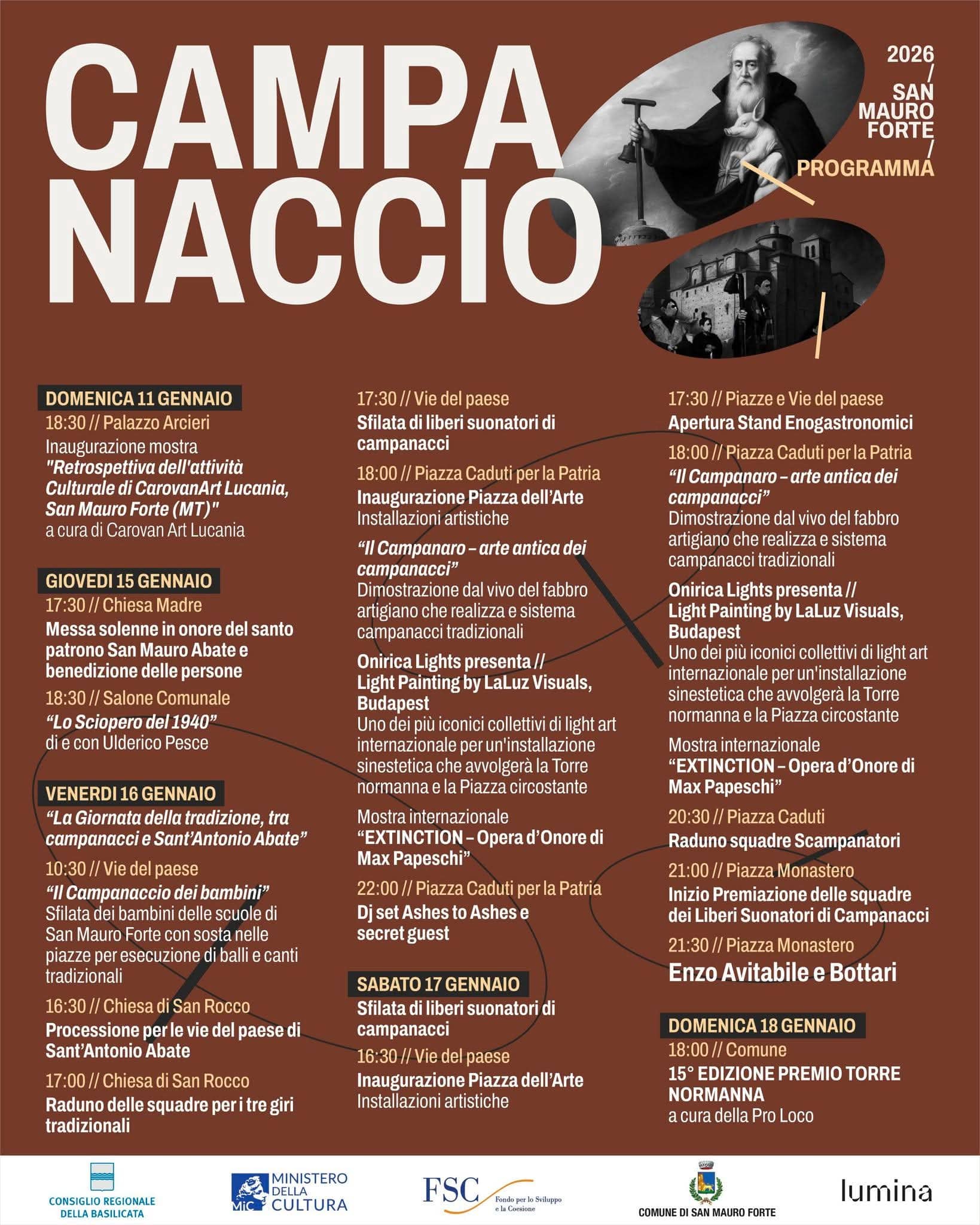 Gennaio 15, 2026 Luci e musica per il Campanaccio di San Mauro ForteIl 16 e 17 gennaio, a San Mauro Forte, si rinnova la sinergia tra l’antica tradizione del Campanaccio,...