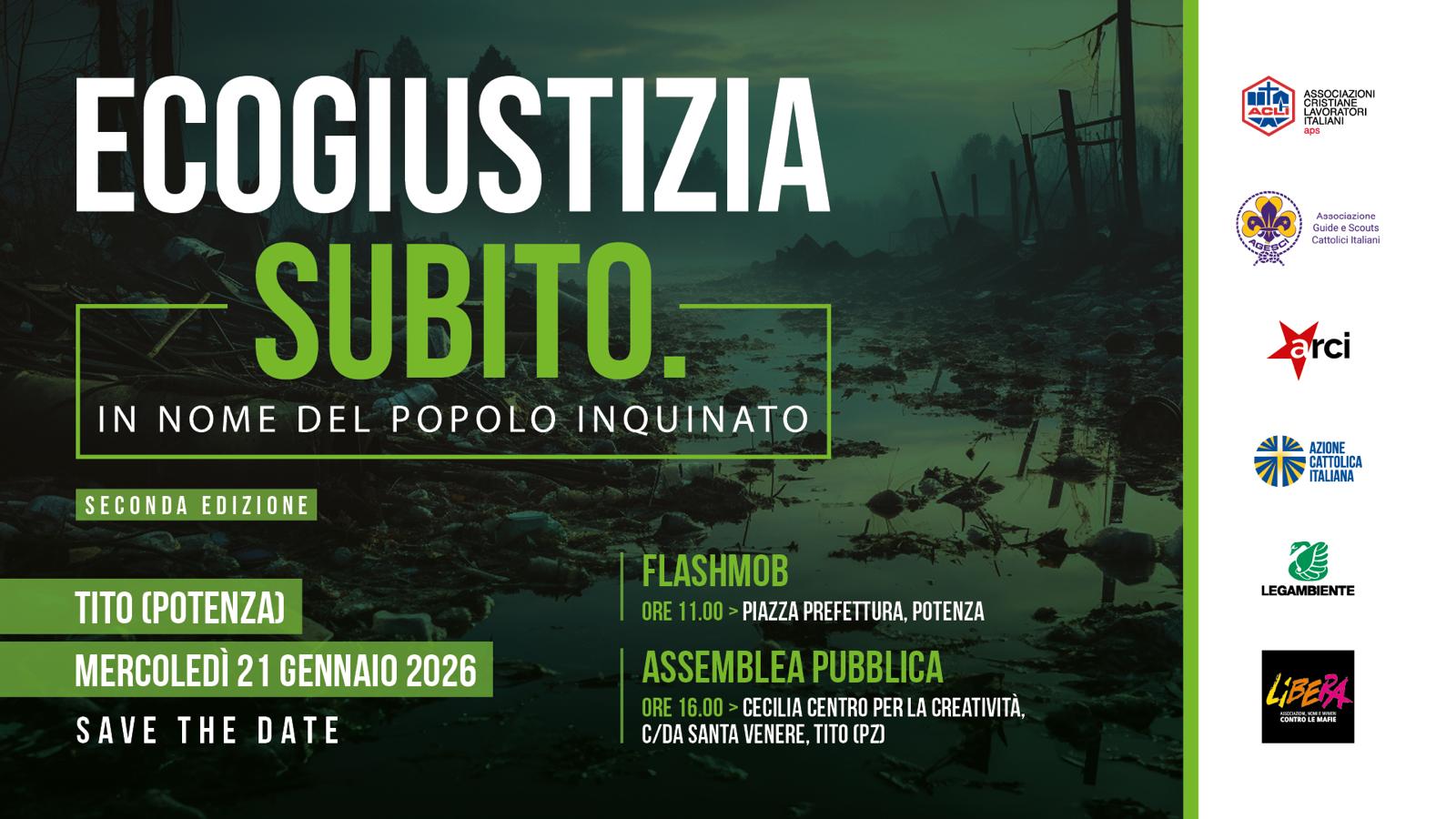 Gennaio 16, 2026 Ecogiustizia, il 21 gennaio tappa a PotenzaLa campagna nazionale “Ecogiustizia Subito: in nome del popolo inquinato”, promossa da ACLI, AGESCI, ARCI, Azione Cattolica, Legambiente...