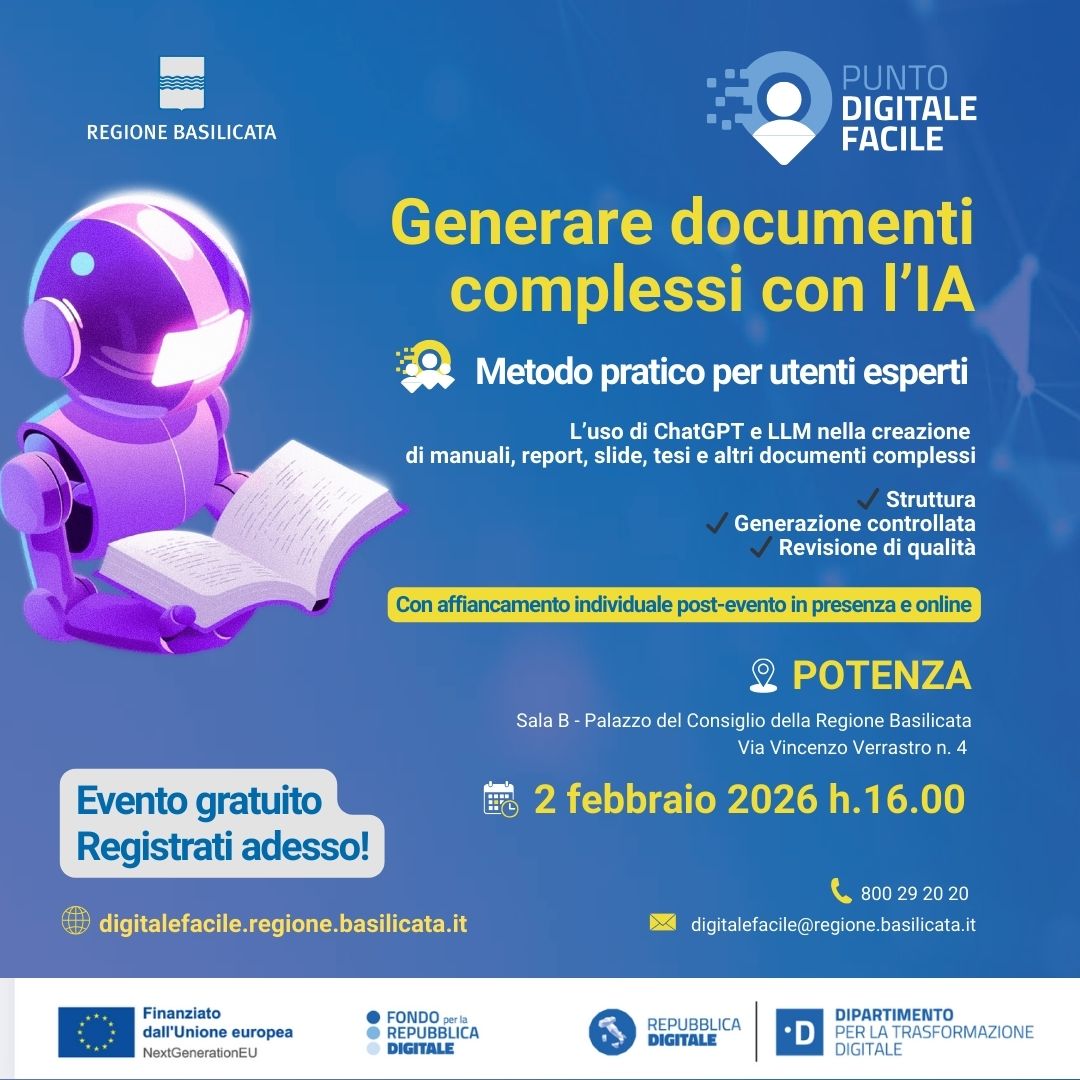 Gennaio 26, 2026 Corso sull’AI per generare documenti complessiSi terrà lunedì 2 febbraio 2026, alle ore 16:00, presso la Sala B del Palazzo del Consiglio della...