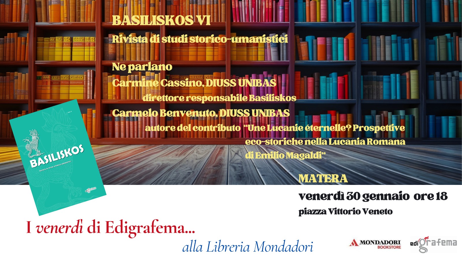 Gennaio 28, 2026 La rivista Basiliskos venerdì 30 gennaio a MateraNell’ambito della rassegna “I venerdì di Edigrafema alla Libreria Mondadori”, il 30 gennaio, alle ore 18, si svolgerà...