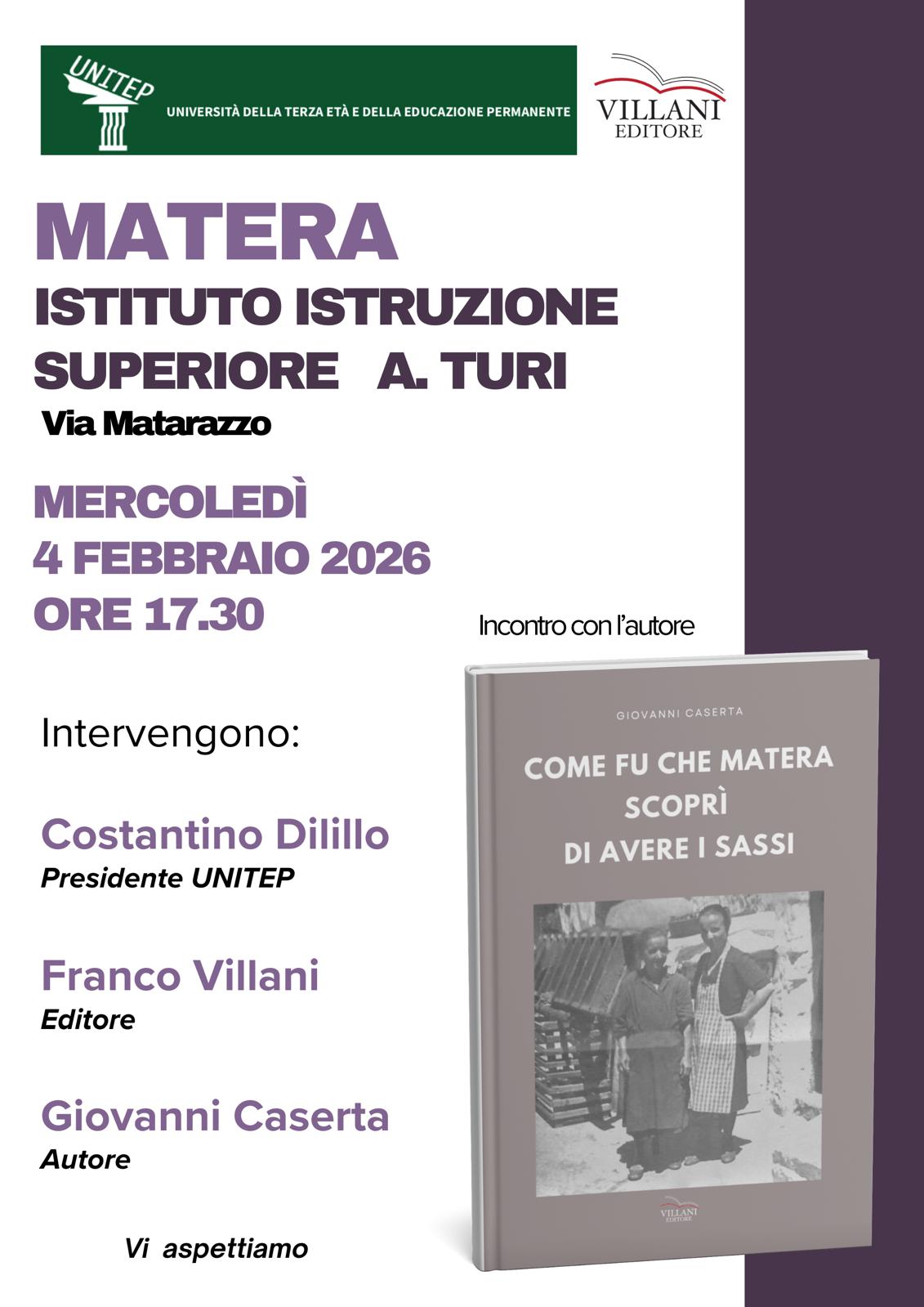 Febbraio 3, 2026 Matera e i Sassi in un libro di Giovanni CasertaDomani 4 febbraio, ore 17,30, nell'Istituto Istruzione Superiore “A. Turi”, Via Matarazzo, Giovanni Caserta presenterà il suo libro...