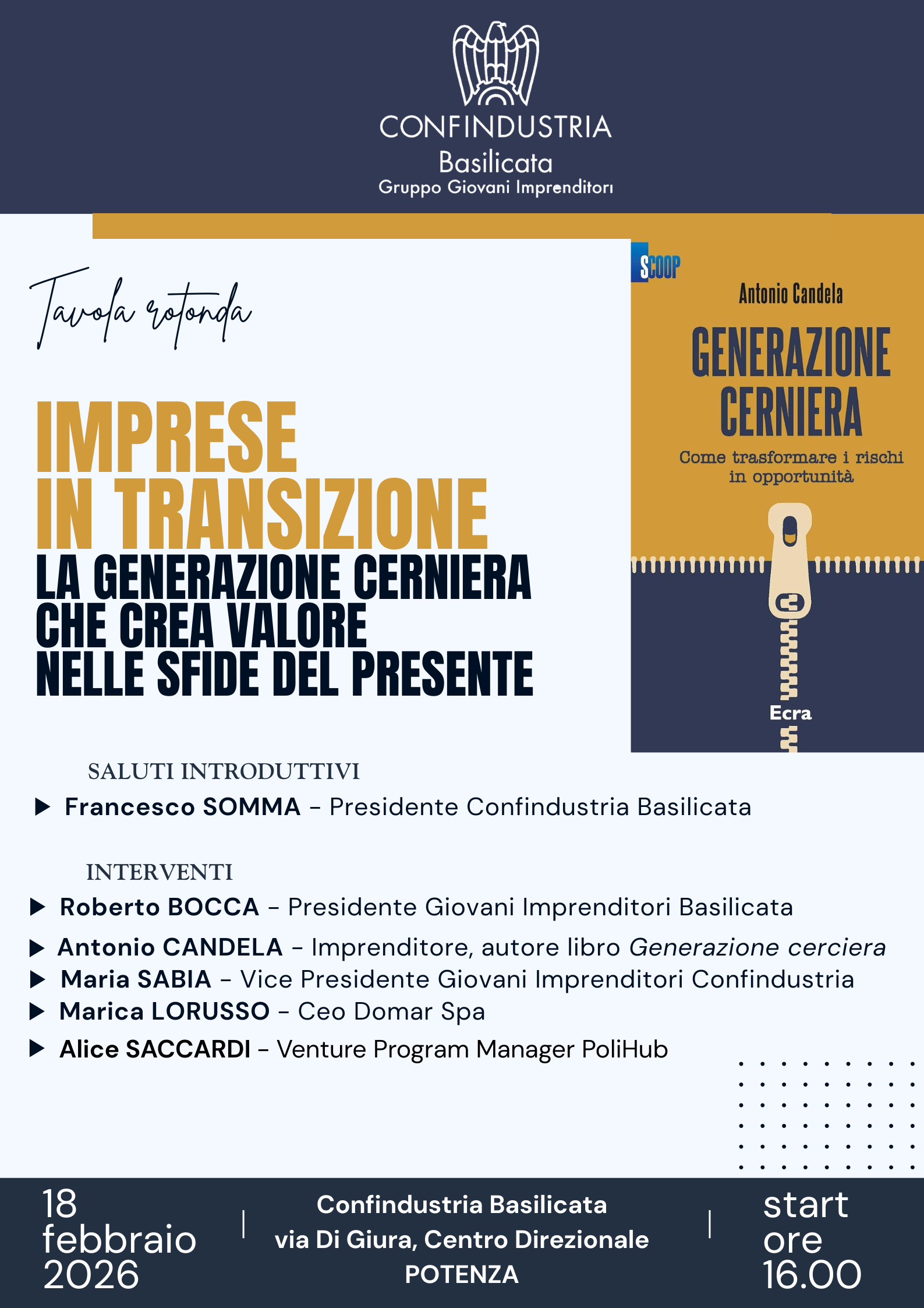 Febbraio 16, 2026 “Generazione cerniera”: capitale strategico per impreseI Giovani Imprenditori di Basilicata promuovono un confronto a più voci sulla transizione generazionale all’interno dei contesti aziendali...