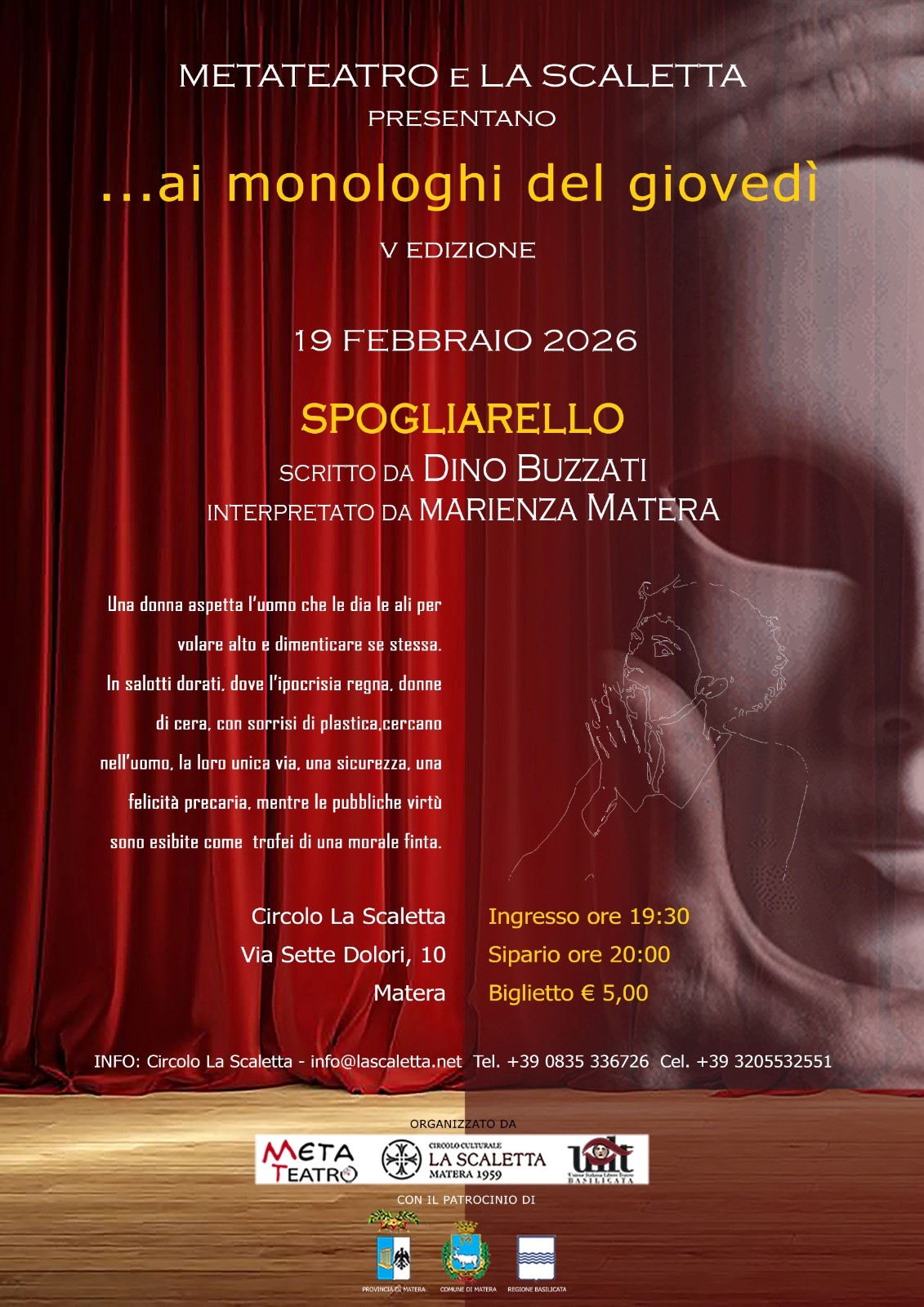 Febbraio 16, 2026 A Matera “Spogliarello” di Dino BuzzatiProsegue la rassegna “…ai monologhi del giovedì”, giunta alla V edizione, promossa da Metateatro e dal Circolo Culturale...