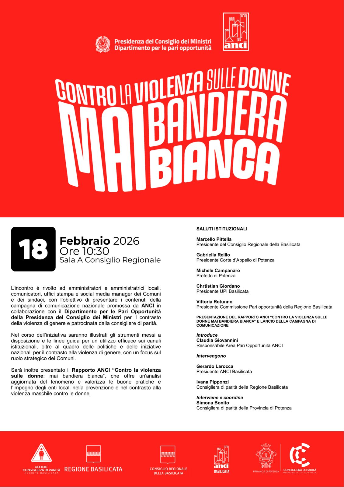 Febbraio 16, 2026 Violenza sulle donne, mai bandiera biancaSi terrà il prossimo 18 febbraio alle ore 10:30, presso la Sala A del Consiglio regionale della Basilicata,...