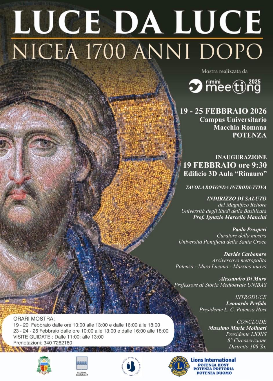 Febbraio 17, 2026 Mostra “Luce da Luce. Nicea 1700 anni dopo”Dal 19 al 25 febbraio 2026 l’Università degli Studi della Basilicata ospiterà, presso il Campus Universitario di Macchia...