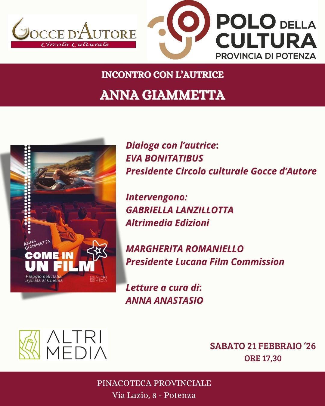 Febbraio 17, 2026 Incontro con l’autrice Anna GiammettaCome in un film. Viaggio nell’Italia ispirata al cinema è il libro scritto da Anna Giammetta, Altrimedia Edizioni,...