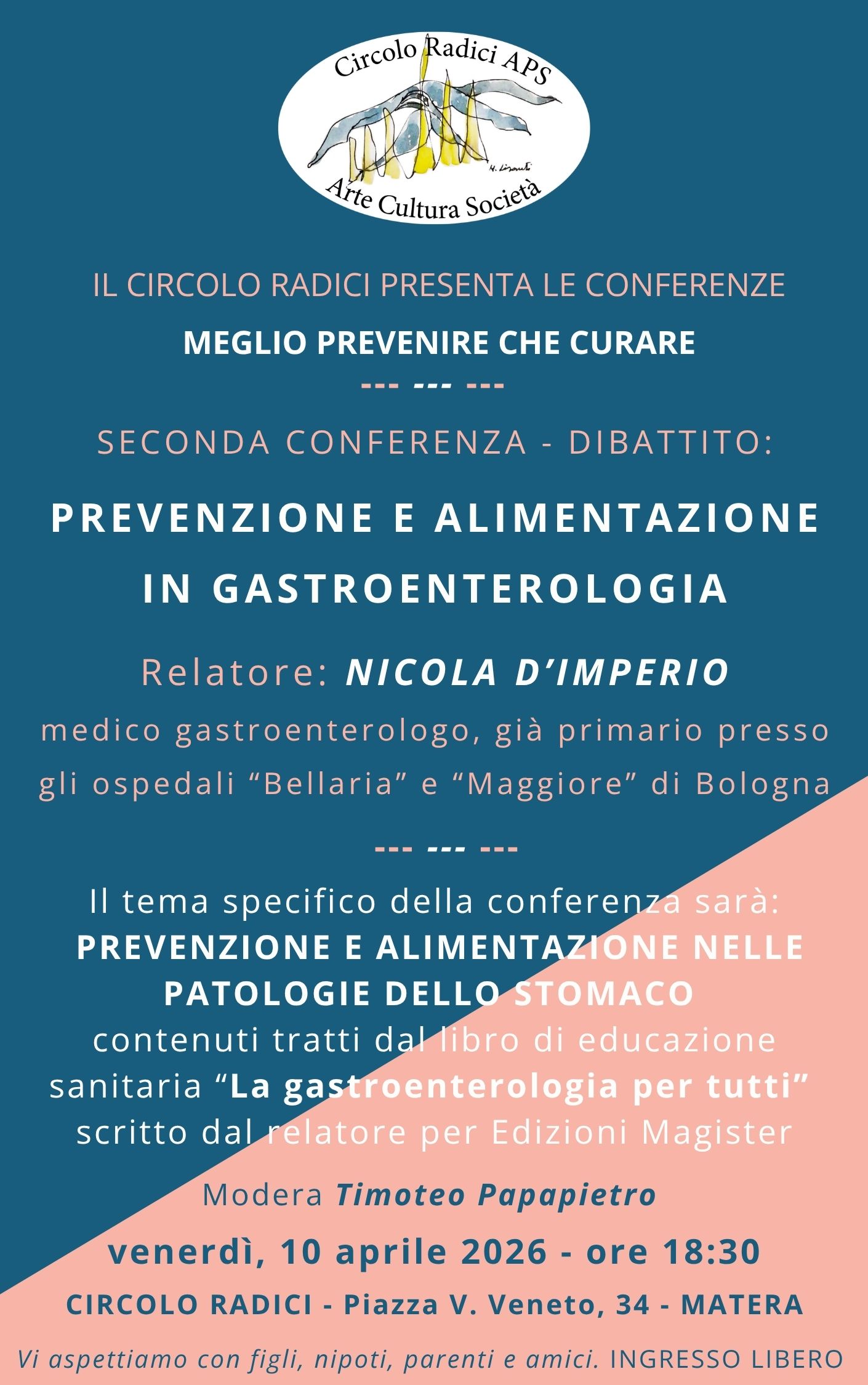 Aprile 9, 2026 Secondo evento di “Meglio prevenire che curare”Il Circolo Radici Aps annuncia il secondo appuntamento della rassegna di conferenze-dibattito per una corretta educazione sanitaria intitolata...