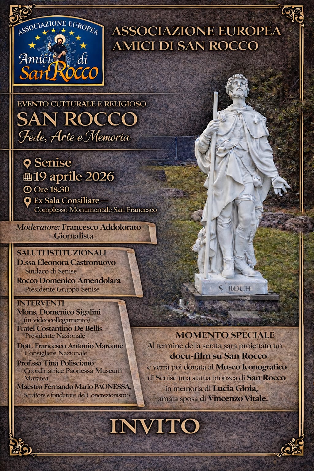 Aprile 17, 2026 Senise celebra San Rocco tra fede, arte e memoriaSi terrà domenica 19 aprile 2026, alle ore 18:30, presso l’Ex Sala Consiliare del Complesso Monumentale San Francesco...