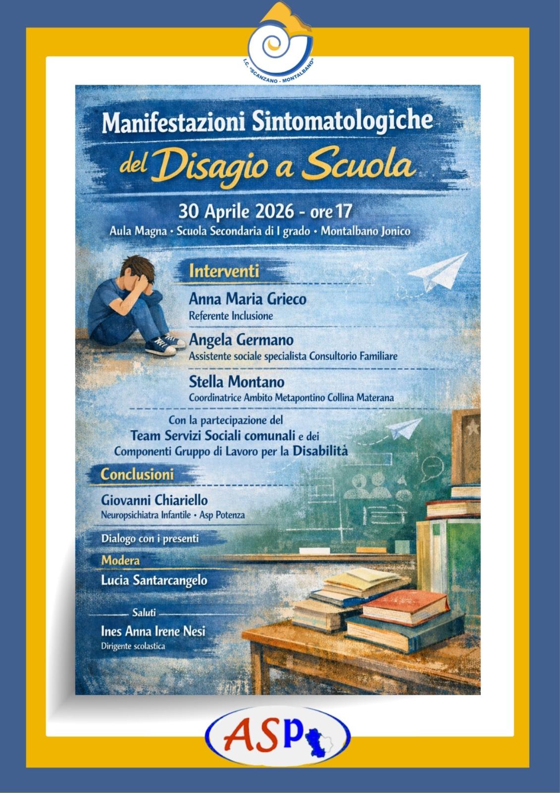 Aprile 28, 2026 Asp, incontro su disagio psicologico a scuolaSi svolgerà il 30 aprile presso l'Aula Magna della scuola media di Montalbano Jonico l'incontro, patrocinato da Asp...