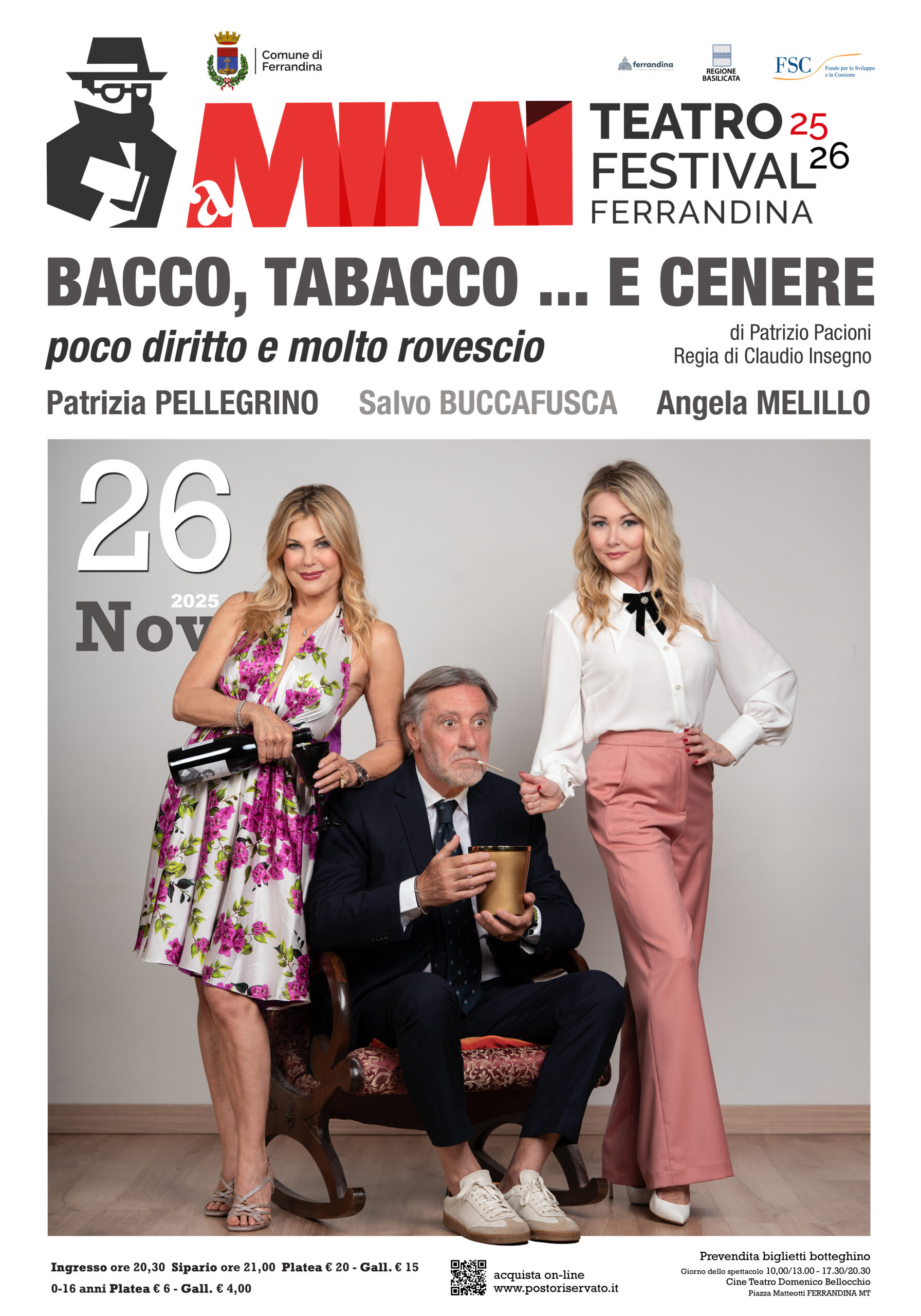 Novembre 24, 2025 In scena la commedia “Bacco, Tabacco… e Cenere”Il Teatro Festival Ferrandina – A Mimì, mercoledì 26 novembre, inaugura la nuova stagione 2025/26 con una commedia...