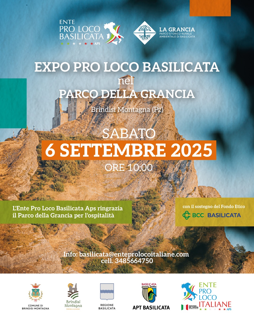 Settembre 3, 2025 Expo delle Pro Loco a Brindisi di MontagnaTutto pronto a Brindisi Montagna per l'Expo Pro Loco Basilicata nel Parco della Grancia promosso dall' Ente Pro...