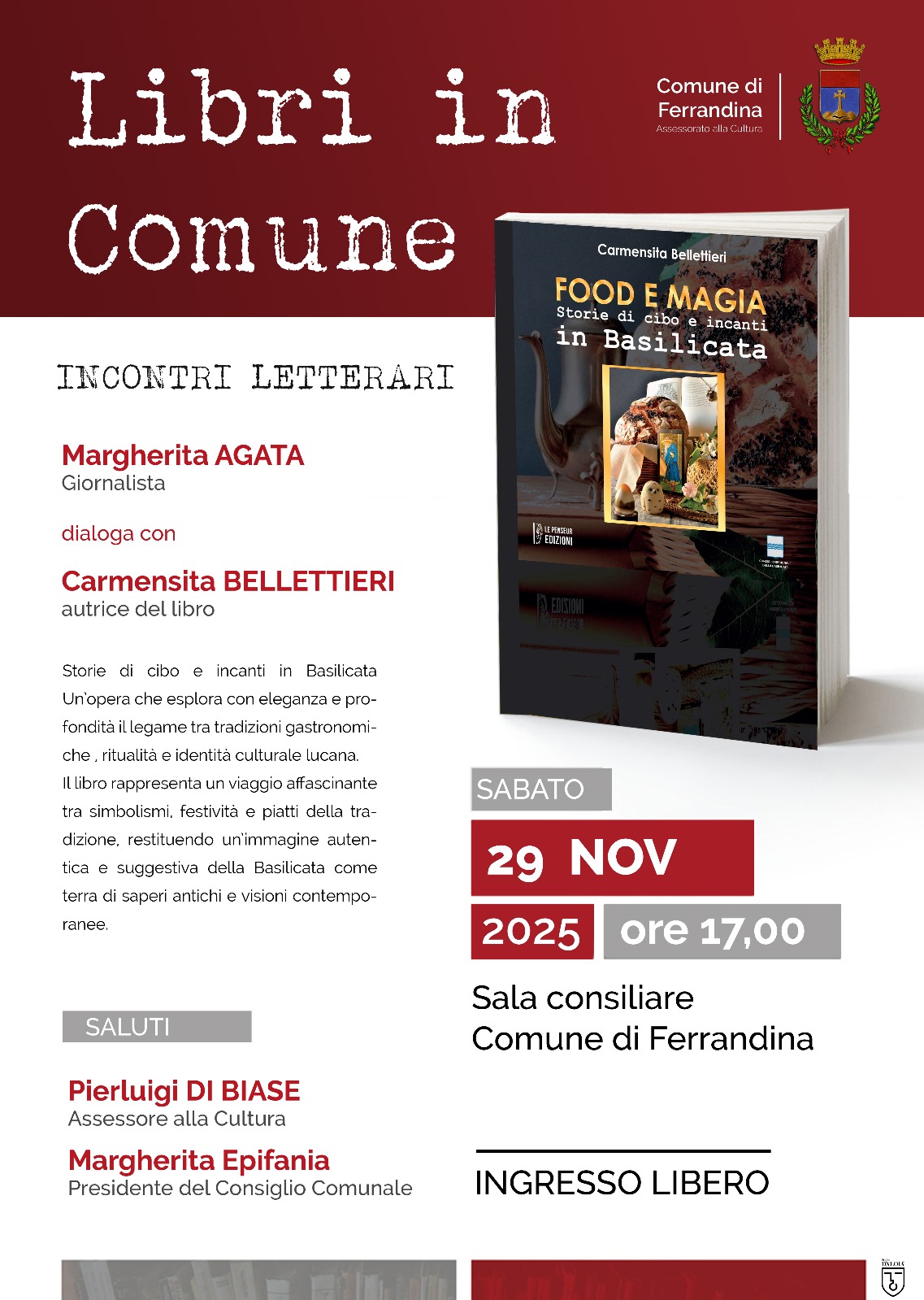 Novembre 26, 2025 A Ferrandina sabato 29 novembre “Food e Magia”Libri in Comune: a Ferrandina Carmensita Bellettieri presenta Food e Magia Sabato 29 novembre 2025 alle ore 17.00...