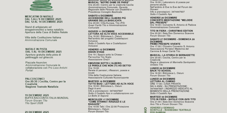 Il programma spazia dai tradizionali Mercatini di Natale, che vedranno protagonisti decine di artigiani e commercianti titesi con le loro eccellenze enogastronomiche e artigianali, alla Casa di Babbo Natale presso la Villa della Costituzione Italiana.