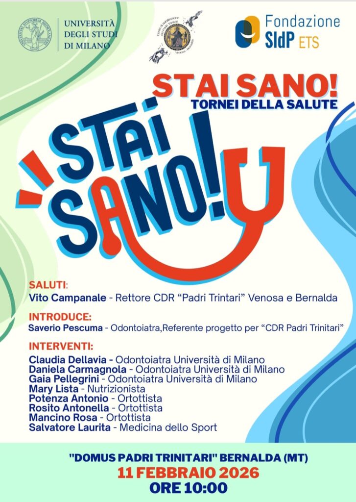 Si svolgerà domani 11 febbraio a Bernalda, nella Domus dei Padri Trinitari, la seconda tappa di “StaiSano! Tornei della Salute”, iniziativa nazionale itinerante dedicata alla promozione di sani stili di vita, con particolare attenzione all’inclusione dei giovani con disturbo dello spettro autistico. Il progetto è promosso dall’Università degli Studi di Milano, nell’ambito di un bando del Ministero dello Sport, con il supporto della Fondazione SIdP ETS e coinvolge medici e professionisti della salute impegnati in attività formative e ludiche rivolte ai partecipanti.