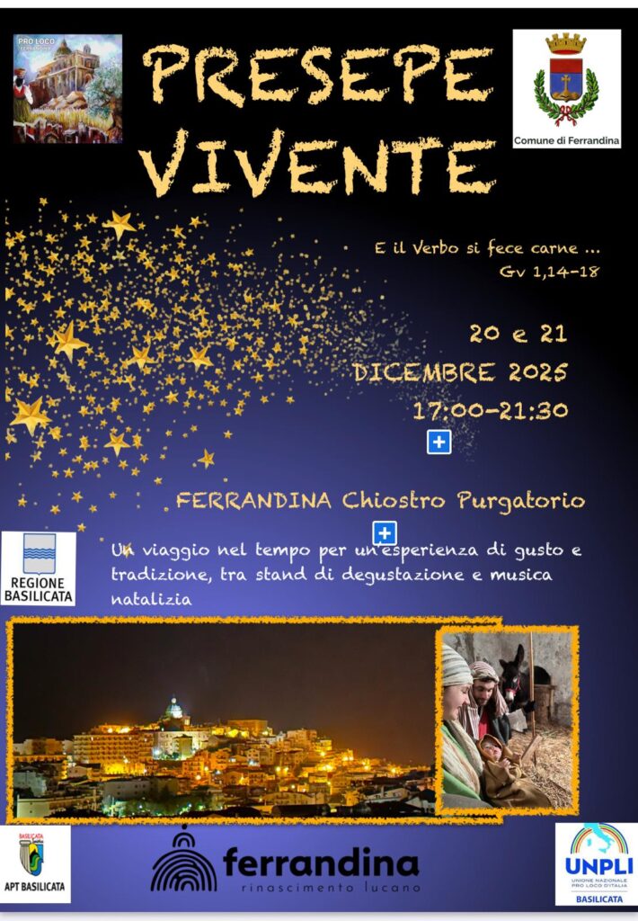 Ferrandina si prepara a rivivere la magia del Natale con la seconda edizione del Presepe Vivente, un evento che trasforma il centro storico in un racconto a cielo aperto. Il 20 e 21 dicembre 2025, dalle 17:00 alle 21:30, il Chiostro Purgatorio si accenderà di luci, suoni e profumi antichi, accogliendo residenti e visitatori in un viaggio emozionale tra fede, tradizione e bellezza.