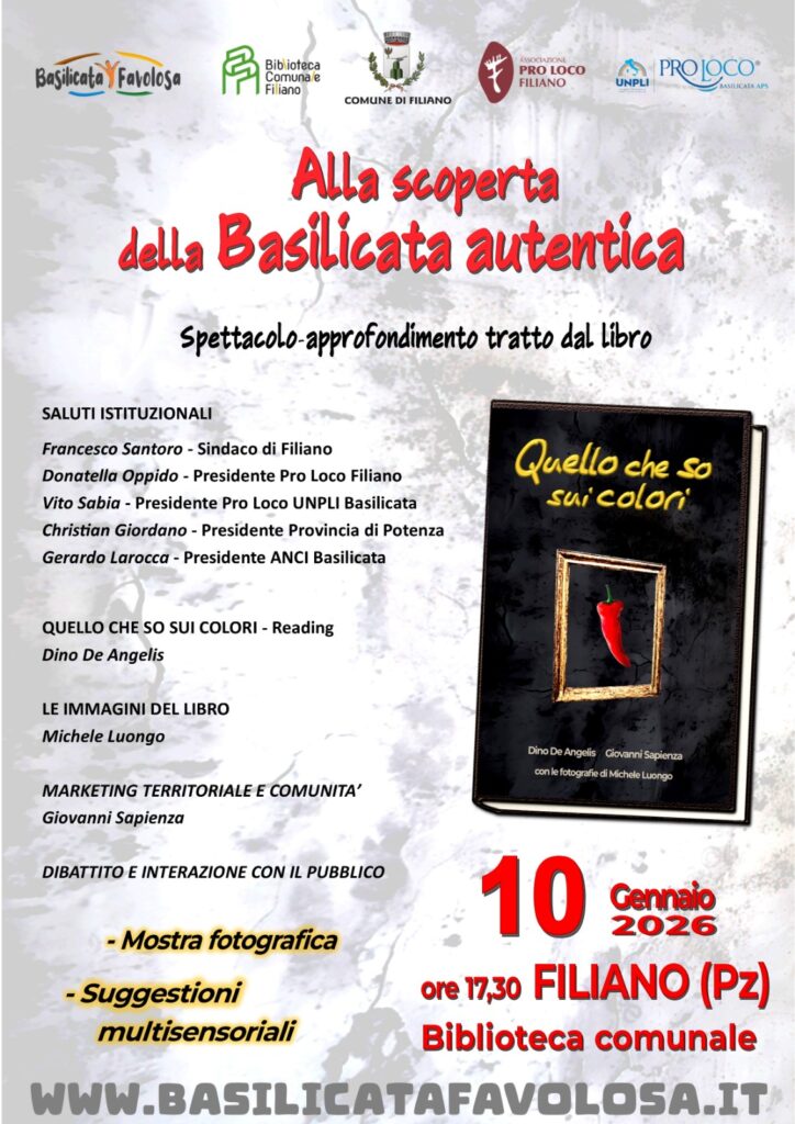 Organizzato da Basilicata Favolosa, Associazione Pro Loco Filiano e Biblioteca Comunale di Filiano, con il patrocinio del Comune di Filiano e dell’UNPLI Basilicata, l’evento si concluderà con un momento di dibattito e interazione con il pubblico, pensato come spazio aperto di confronto, domande e condivisione.