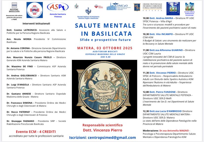 L’evento vedrà la partecipazione, in qualità di relatori, dei sei direttori delle unità di Psichiatria appartenenti ai due Dipartimenti di Salute Mentale dell’Azienda Sanitaria di Matera e dell’Azienda Sanitaria di Potenza.