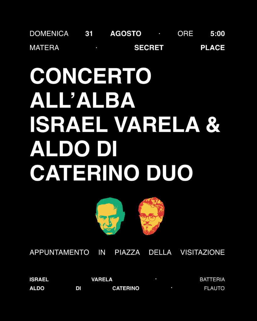 Il concerto all’alba è da sempre un marchio distintivo del festival, quest’anno alla sua 38ª edizione, organizzato dall’associazione culturale materana Onyx Jazz Club. Una scelta dal sapore romantico, alle prime luci del giorno, che sono l’annuncio di un tempo tutto da scoprire e da vivere, un po’ come l’improvvisazione nel jazz, in un mix di colori, di odori, di suoni. Con una performance totalmente improvvisata e con note ricche di magia l’inconfondibile stile “latino” di Israel Varela, batteria, uno degli artisti più richiesti in Europa, e il talento del giovanissimo Aldo Di Caterino, flauto, condurranno quasi per mano il pubblico del Gezziamoci in un mondo incantato dove le emozioni, le suggestioni, le fantasie sono di casa. Una colazione abbondante offerta dal Gezziamoci farà tutto il resto.