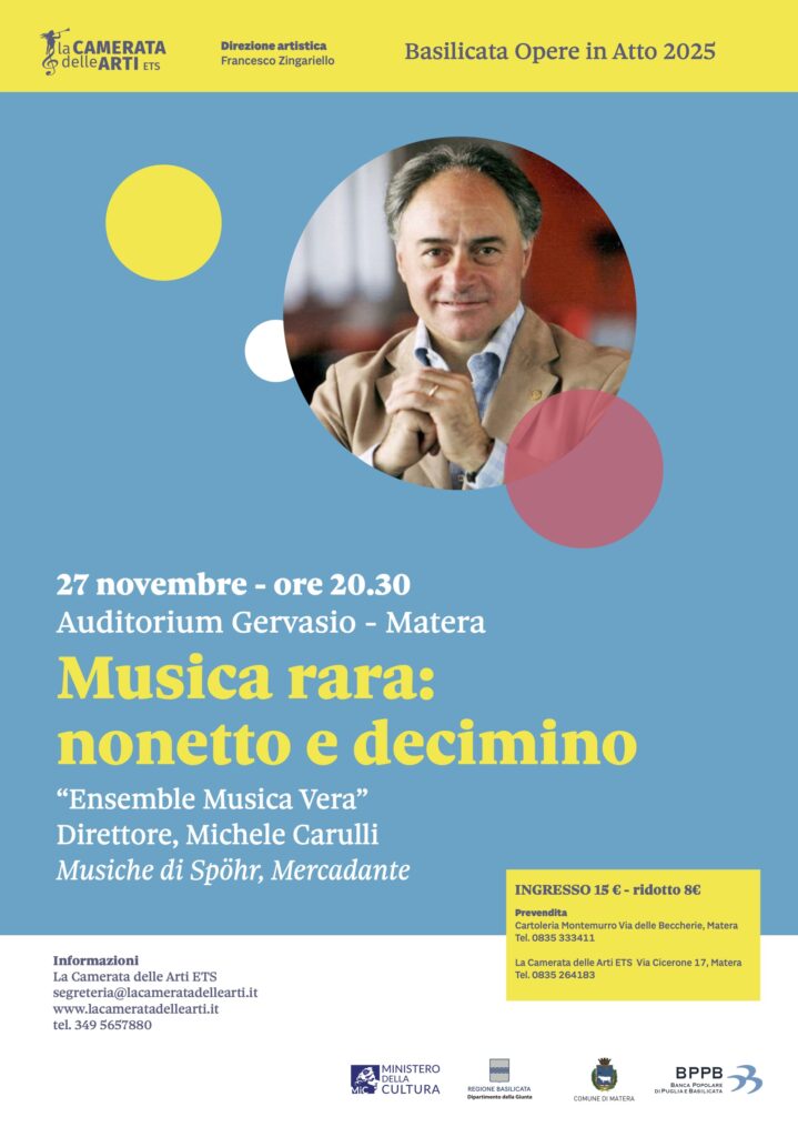 Giovedi 27 novembre, ore 20.30, nell’Auditorium Gervasio di Matera, concerto dal titolo “Musica rara, nonetto e decimino”, con l’esecuzione di pagine musicali poco eseguite ma, al contempo, di straordinaria bellezza e suggestione.