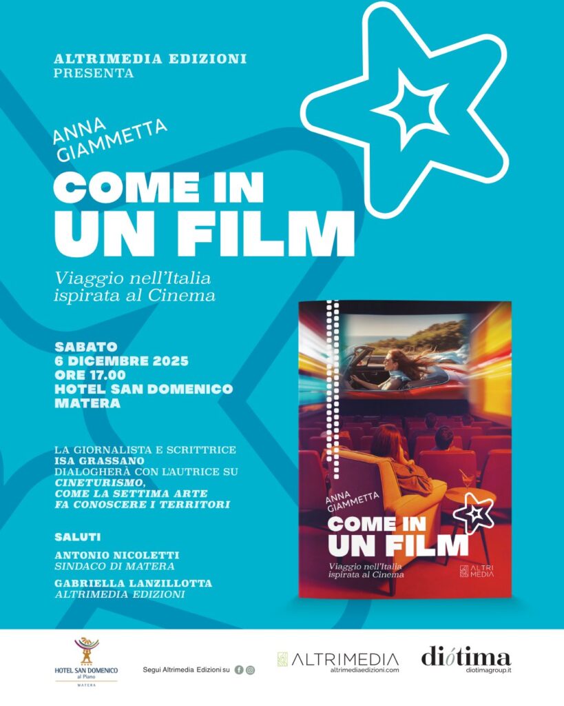 Sabato 6 dicembre alle ore 17 presso l’hotel San Domenico, a Matera, terzo appuntamento con Come in un film. Viaggio nell’Italia ispirata al cinema la pubblicazione firmata da Anna Giammetta. Al centro di questo terzo incontro, a solo un mese dall’uscita del titolo, il cineturismo come chiave di sviluppo economico dei territori.