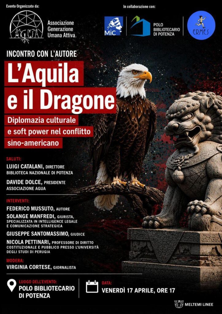 Il 17 aprile, alle ore 17, il Polo Bibliotecario di Potenza, in Via Minozzi, ospiterà la presentazione del libro “L’Aquila e il Dragone. Diplomazia culturale e soft power nel conflitto sino-americano” di Federico Mussuto, in un evento organizzato dall’Associazione AGUA Aps.