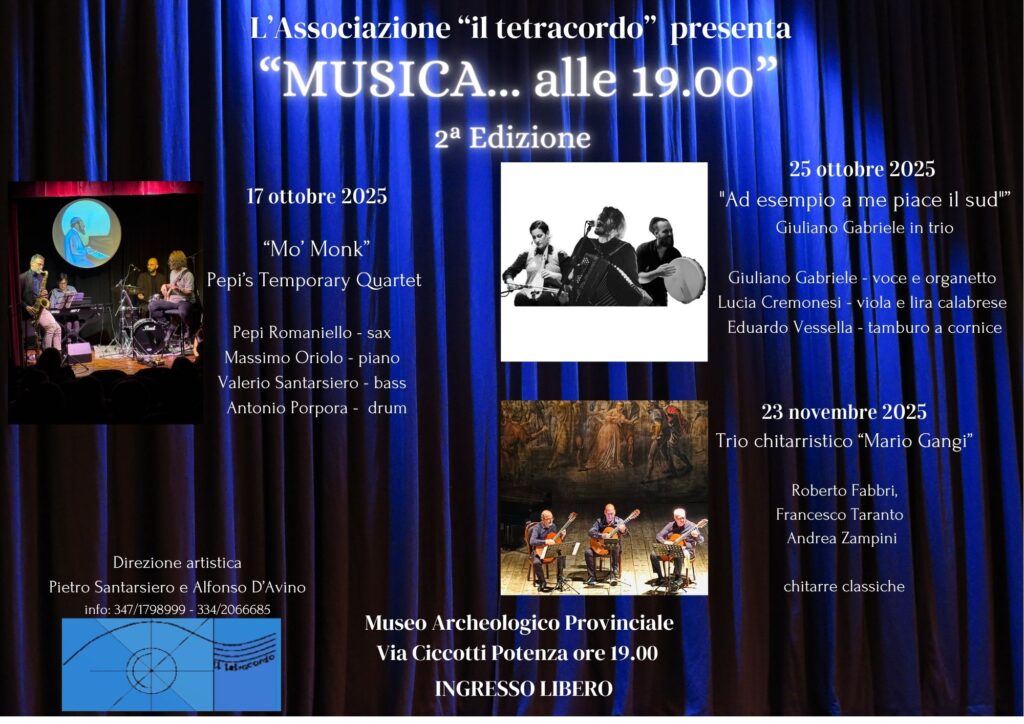 Avrà inizio venerdì 17 ottobre, nel museo archeologico provinciale in via Ciccotti a Potenza, la 2° stagione concertistica “Musica alle 19”, promossa dall’Associazione “il tetracordo”. Gli spettacoli spazieranno tra vari generi musicali, con musicisti provenienti da varie regioni italiane.
