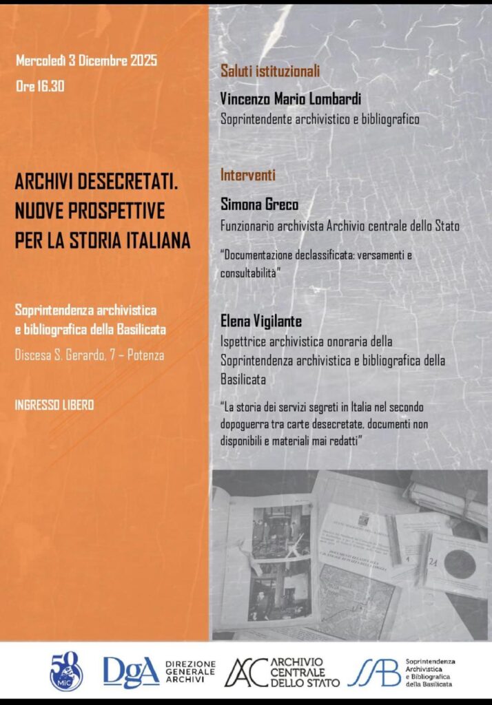 Domani, mercoledì 3 dicembre, alle ore 16.30, la Soprintendenza archivistica e bibliografica della Basilicata (Discesa San Gerardo 7 – Potenza) ospita l’incontro “Archivi desecretati. Nuove prospettive per la storia italiana”, dedicato alla recente documentazione declassificata e alle nuove possibilità di ricerca.