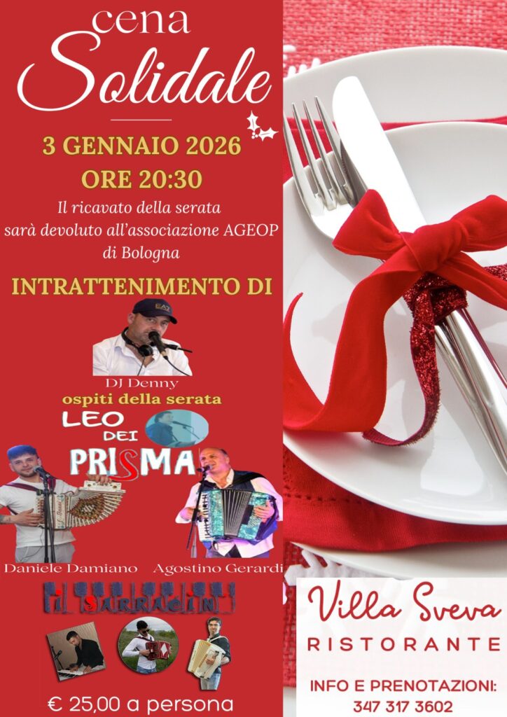 È in programma per sabato 3 gennaio 2026, presso il ristorante Villa Sveva, nella frazione Chicone di Avigliano, una Cena Solidale a sostegno dell’AGEOP – Associazione Genitori Ematologia Oncologia Pediatrica.