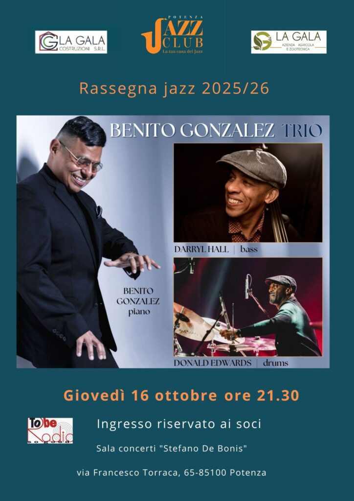 Il Jazz Club Potenza inaugura la quarta edizione della Rassegna Jazz con un concerto d’apertura di grande prestigio. Mercoledì 16 ottobre alle ore 21.30, nella sede di via Francesco Torraca 65, salirà sul palco il pianista venezuelano Benito Gonzalez, accompagnato da Darryl Hall al contrabbasso e Donald Edwards alla batteria. L’ingresso è riservato ai soci ed è aperto il tesseramento per l’anno 2026. Per partecipare è possibile richiedere informazioni e sottoscrivere la tessera contattando il Jazz Club Potenza all’indirizzo jazzclubpotenza@gmail.com (cell.3508273595).