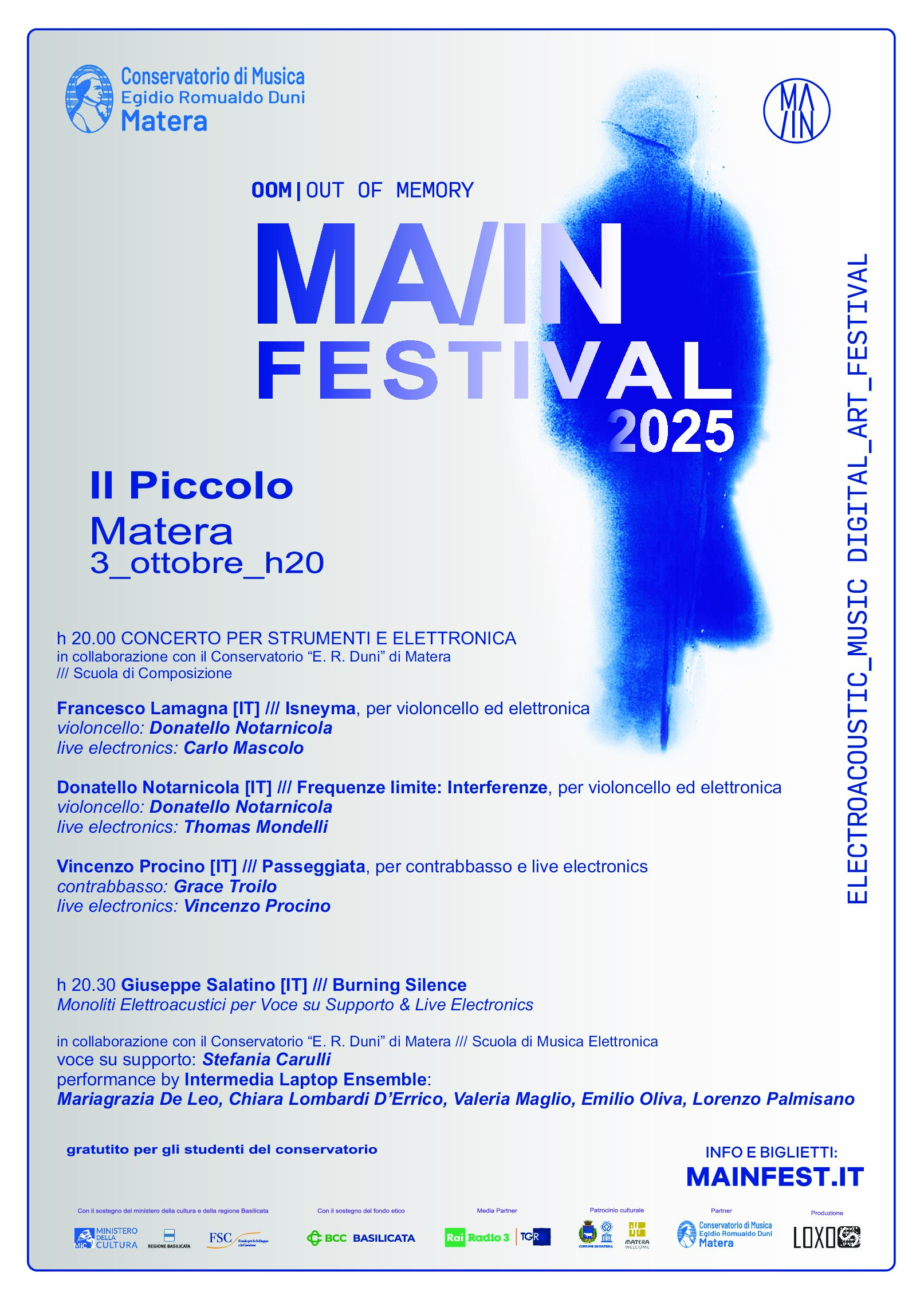 Venerdì 3 ottobre alle ore 20.00, presso il Cinema “Piccolo” di Matera, il MA/IN Festival 2025 – ospiterà un concerto interamente dedicato al dialogo fra strumenti acustici ed elettronica, in collaborazione con la Scuola di Composizione e la Scuola di Musica Elettronica del Conservatorio “E.R. Duni” di Matera.