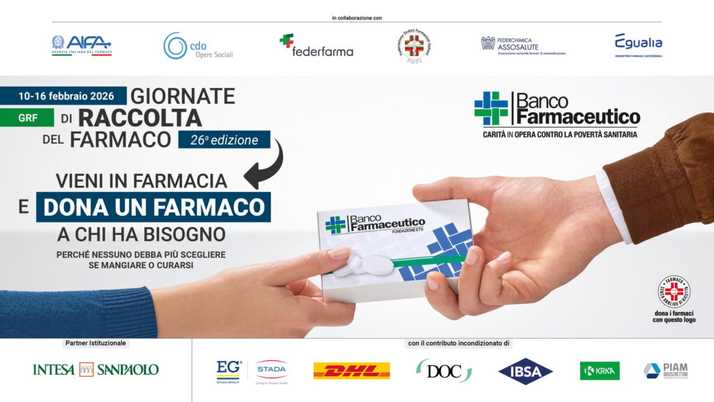 Nel 2026, da martedì 10 a lunedì 16 febbraio, si svolge la 26ª edizione delle Giornate di Raccolta del Farmaco. In 6.000 farmacie che partecipano in tutte le città italiane (espongono la locandina dell’iniziativa – L’elenco è consultabile su www.bancofarmaceutico.org), si chiede ai cittadini di donare uno o più medicinali da banco per chi ha bisogno.