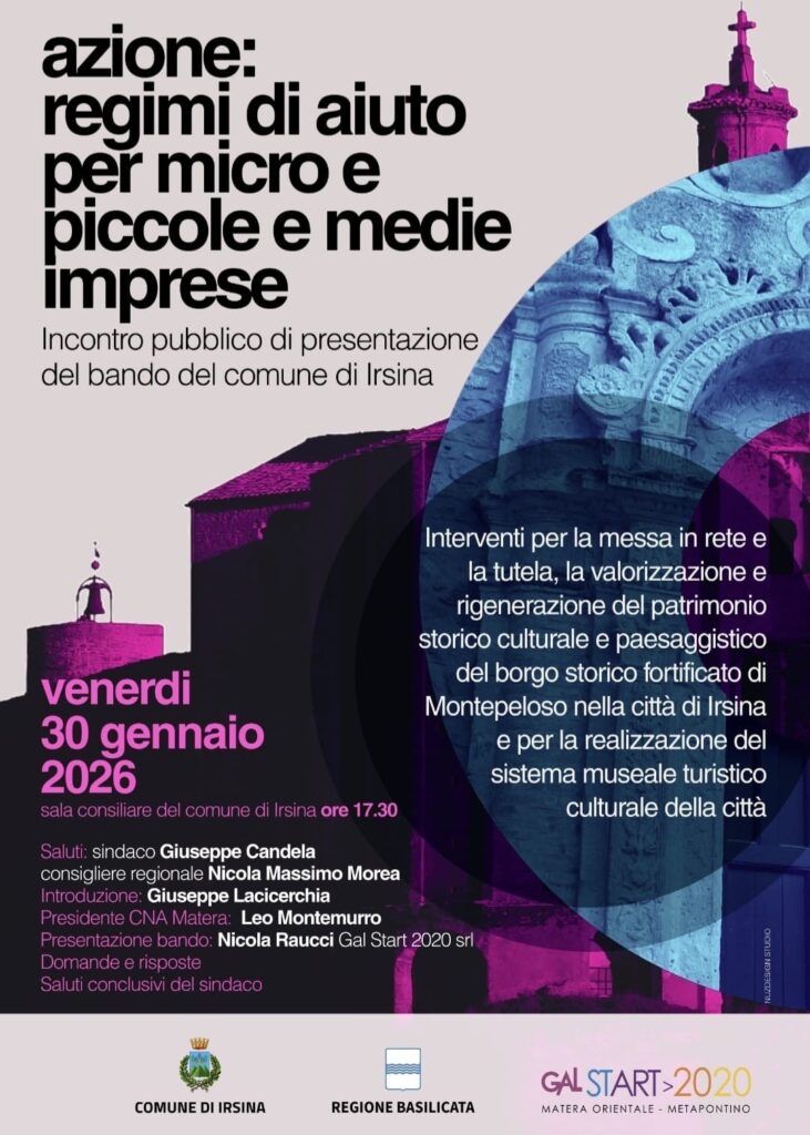 Venerdì 30 gennaio 2026, alle ore 17.30, presso la Sala Consiliare del Comune di Irsina, si terrà la presentazione pubblica del bando comunale a sostegno delle micro, piccole e medie imprese.