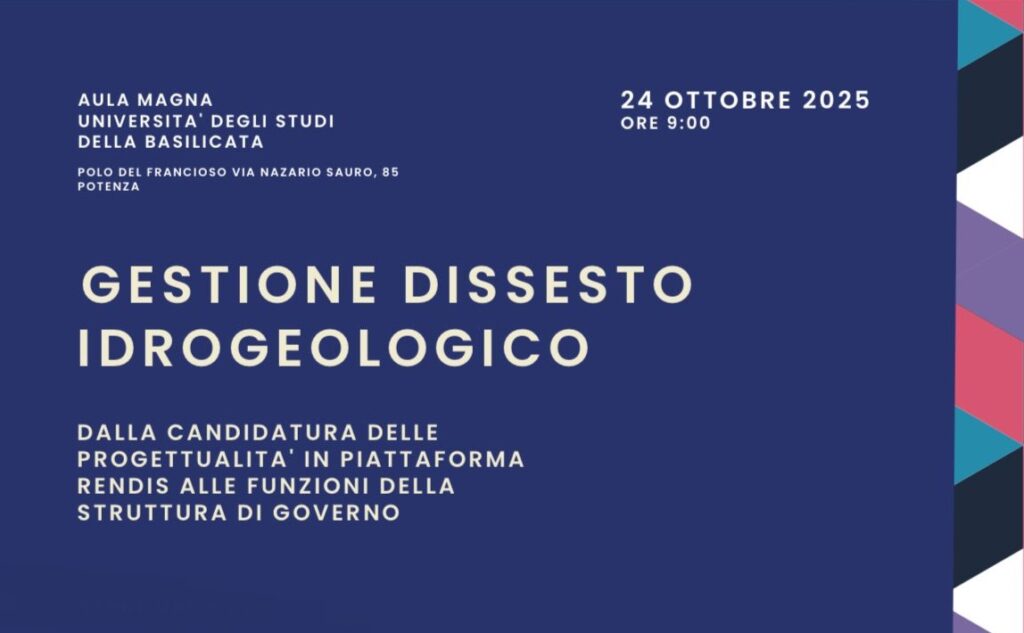 Il commissario di Governo per il contrasto al dissesto idrogeologico, la Direzione Generale per le Infrastrutture della Regione Basilicata e l’Anci (Associazione Nazionale Comuni Italiani) promuovono una giornata formativa dal titolo “Gestione dissesto idrogeologico: dalla candidatura delle progettualità in piattaforma ReNDiS alle funzioni della struttura di Governo”, in programma il 24 ottobre 2025 alle ore 9.00 nell’Aula Magna dell’Università degli Studi della Basilicata, in rione Francioso a Potenza.