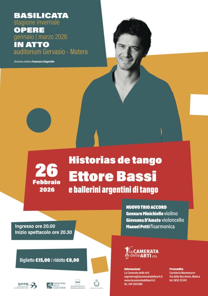 Giovedi 26 febbraio, ore 20.30, nell’Auditorium “Gervasio” di Matera, nuovo appuntamento della stagione Basilicata Opere in Atto 2026 della Camerata delle Arti con “Historias de Tango”: un viaggio nell’anima complessa e appassionata del tango argentino, uno spettacolo che intreccia parola e musica in una narrazione intensa e coinvolgente, guidata dalla voce dell’attore Ettore Bassi, con il supporto musicale di Gennaro Minichiello, violino, Giovanna D’Amato, violoncello, Manuel Petti, fisarmonica, e i ballerini di tango argentino Gisella Tacon e Nelson Piliu.