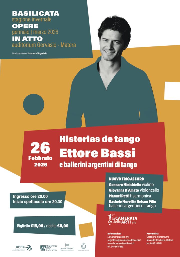 Giovedi 26 febbraio, ore 20.30, nell’Auditorium “Gervasio” di Matera, nuovo appuntamento della stagione Basilicata Opere in Atto 2026 della Camerata delle Arti con “Historias de Tango”: un viaggio nell’anima complessa e appassionata del tango argentino, uno spettacolo che intreccia parola e musica in una narrazione intensa e coinvolgente, guidata dalla voce dell’attore Ettore Bassi, con il supporto musicale di Gennaro Minichiello, violino,Giovanna D’Amato, violoncello, Manuel Petti, fisarmonica, e i ballerini di tango argentino Rachele Morelli e Nelson Piliu.