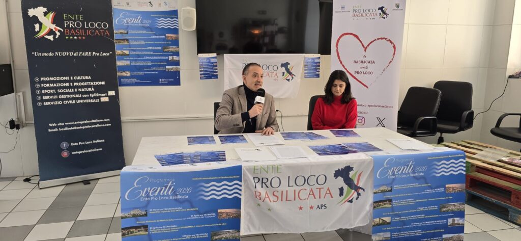 Presentato a Potenza, nella sede di Magazzini Sociali, il calendario degli eventi annuali della Rete regionale Ente Pro Loco Basilicata Aps. Dopo i saluti di Valentina Loponte Direttrice di Magazzini Sociali con cui Ente Pro Loco Basilicata Aps ha sottoscritto tempo fa un protocollo d’intesa per il recupero, a scopi solidali, di eccedenze alimentari e la sensibilizzazione sul territorio lucano di attività contro lo spreco alimentare, è intervenuto il Presidente regionale di Ente Pro Loco Basilicata Aps Rocco Franciosa, il quale ha illustrato gli appuntamenti in programma per l’anno 2026.