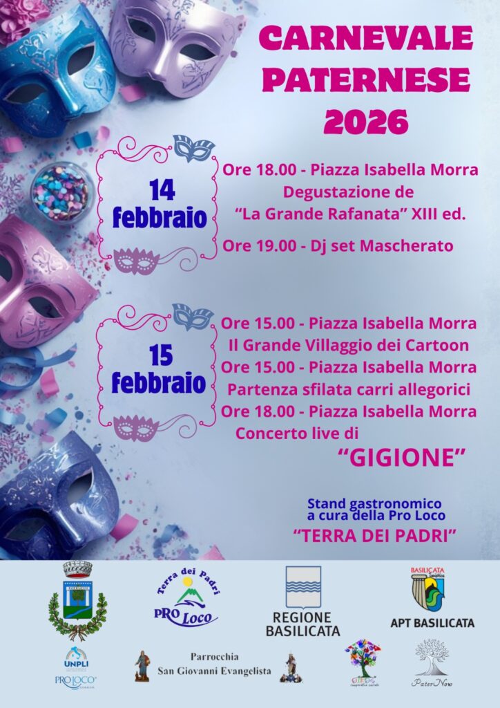 Il calendario in programma per l’edizione 2026 dello storico Carnesciale paternese si presenta ricco e articolato: si inizia sabato 14/02/2026, con la XIII edizione della “Degustazione de La Grande Rafanata” e animazione musicale a cura di Dj Set Mascherato, per poi continuare domenica 15/02/2026, con il Villaggio dei Cartoon, la sfilata dei carri allegorici e del corteo mascherato e, a concludere, il concerto live di Gigione.